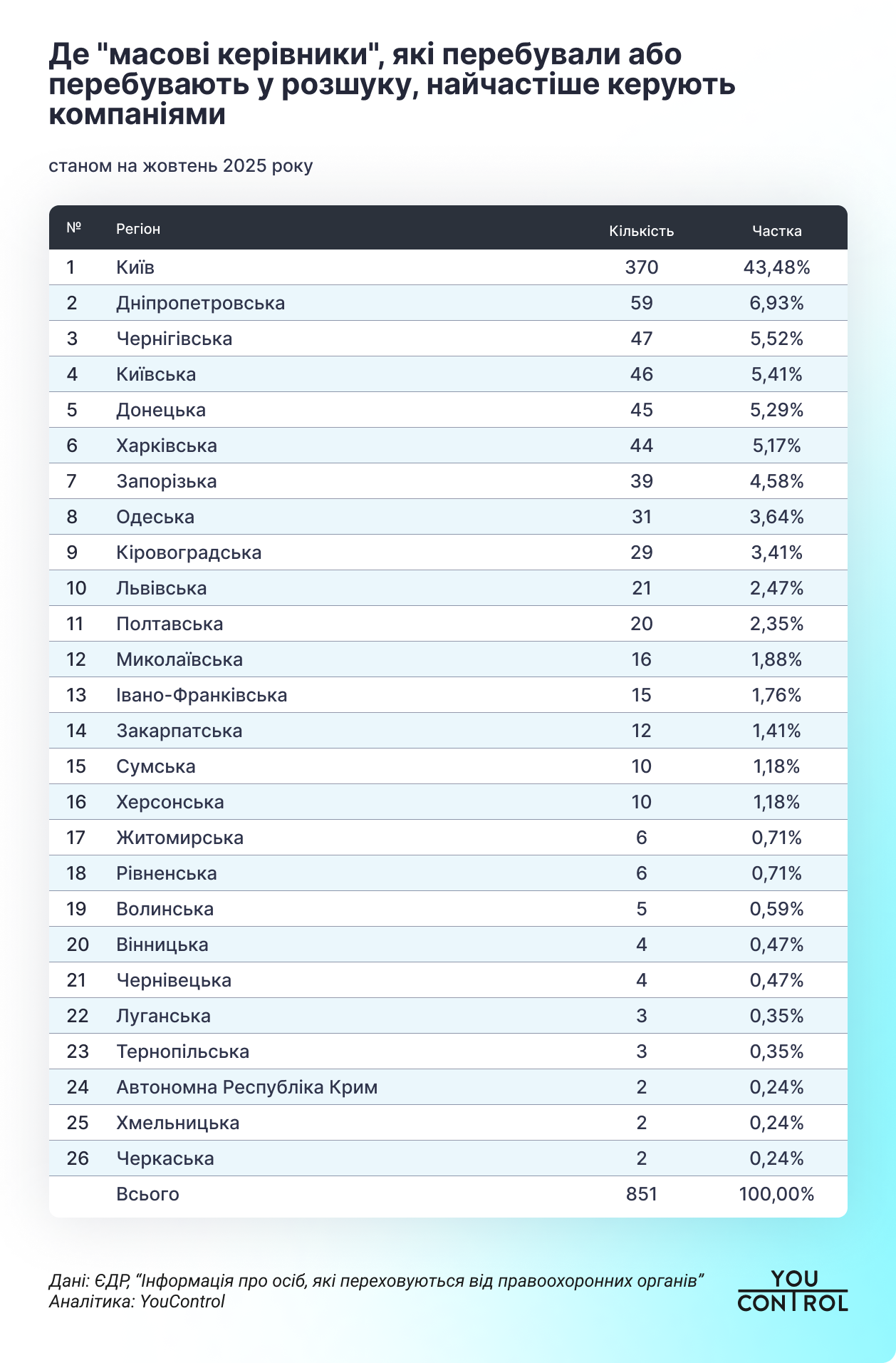 Почти половина находившихся или находящихся в розыске вероятных «массовых руководителей» управляют компаниями в Киеве — 370 бизнесов или 43% от общего количества. Востребованными среди таких серийных предпринимателей также Днепропетровщина (7%), Черниговщина (6,5%), Киевская, Донецкая и Харьковская области с долей по 5% каждая.
