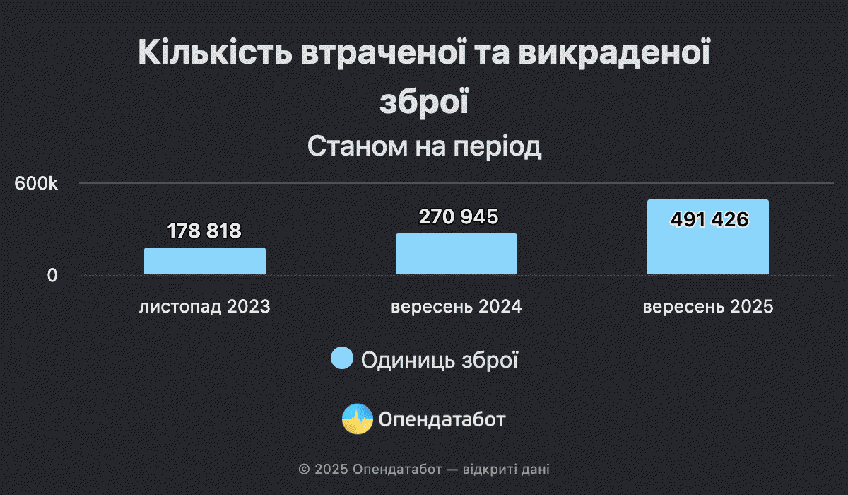 За последний год количество утраченного и похищенного оружия увеличилось в 2 раза: с 270,9 тысячи в сентябре 2024 года до почти полумиллиона в сентябре этого года.