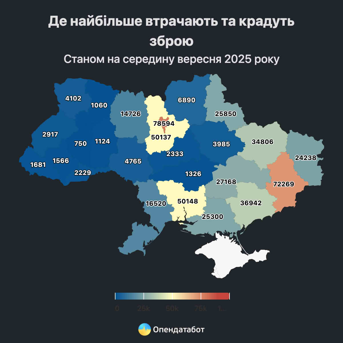 Киев лидирует по количеству пропавшего и утраченного оружия — 78,5 тысяч единиц. На втором месте Донецкая область — 72,2 тысячи единиц оружия. Следуют Николаевская область (50,1 тыс.), Киевская область (50,1 тыс.) и Запорожская область (36,9 тысячи).