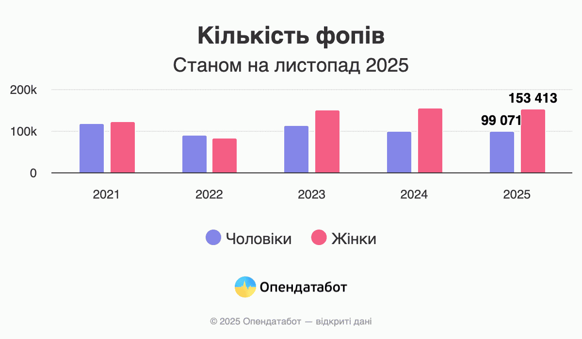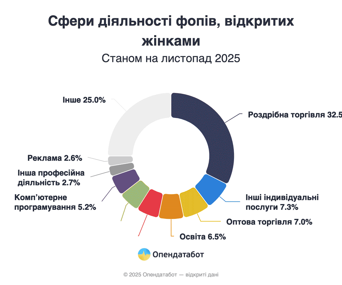 Более 153 тысяч новых ФЛП открыли женщины за 10 месяцев 2025 года в Украине по данным Единого государственного реестра. Это 61% от общего количества вновь созданных ФЛП в 2025 году. Больше всего бизнесов зарегистрировали в этом году женщины в столице, Днепропетровской и Киевской областях. Среди сфер женского предпринимательства лидируют торговля, образование и красота.