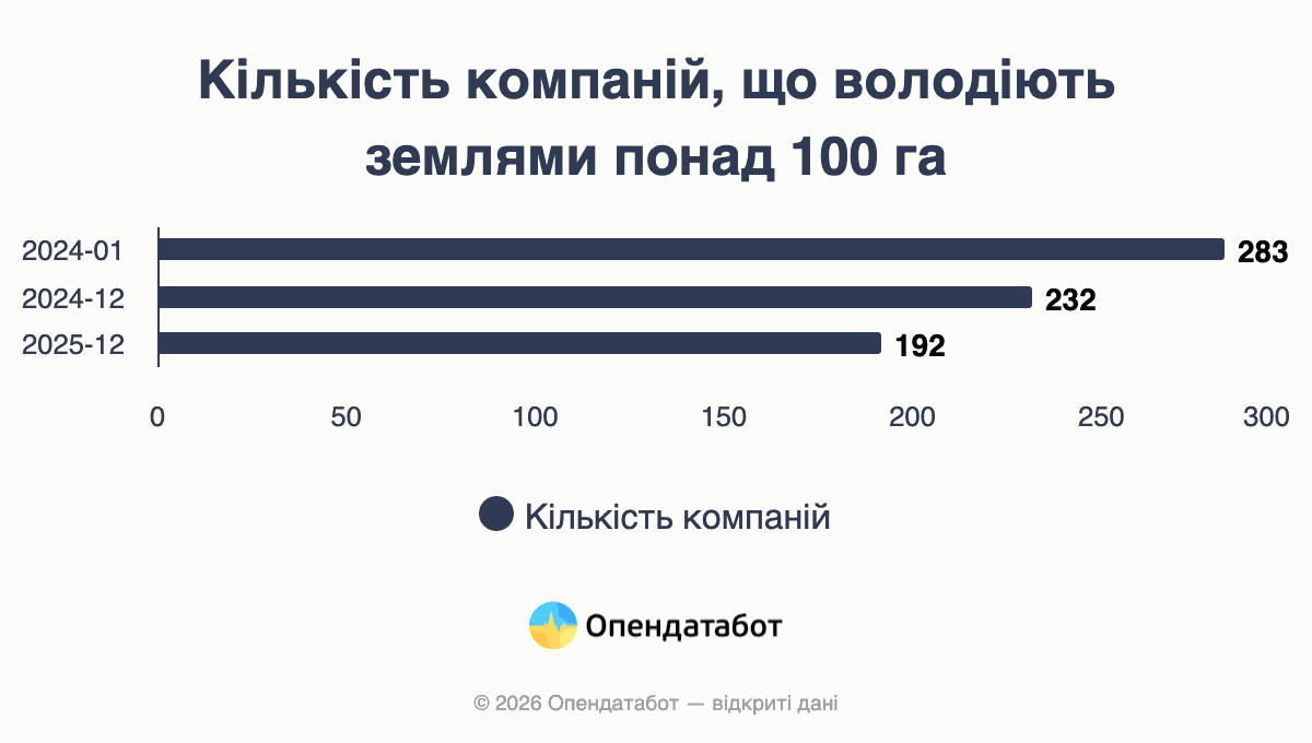 192 компании, в собственности которых находится более 100 гектаров земли, насчитывается в настоящее время в Украине. Для сравнения, на момент открытия рынка земли в 2024 году таких компаний было 283. На 51 компанию сократился перечень крупных землевладельцев в течение 2024 года, а в прошлом году — еще на 40 компаний.