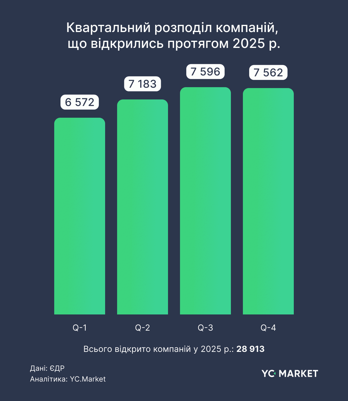 Для анализа мы просмотрели сколько компаний зарегистрировано и сколько прекратило деятельность в период с 01.01.2025 г. по 31.12.2025 г. Стоит отметить, что квартальное распределение подготовлено без учета компаний, которые в течение 2025 года одновременно зарегистрировали и прекратили деятельность. В 2025 году в Украине наблюдалось последовательное оживление регистраций нового бизнеса : после относительно сдержанного старта года в I квартале (6 572 регистраций) показатели росли в течение двух следующих - до 7 183 во II квартале и пиковых 7 596 в III квартале. В IV квартале темп практически стабилизировался на уровне предыдущего периода. В общей сложности за год было зарегистрировано 28 913 компаний, причем более половины регистраций пришлось на второе полугодие, что подчеркивает тренд на постепенное укрепление предпринимательской активности в течение 2025 года.