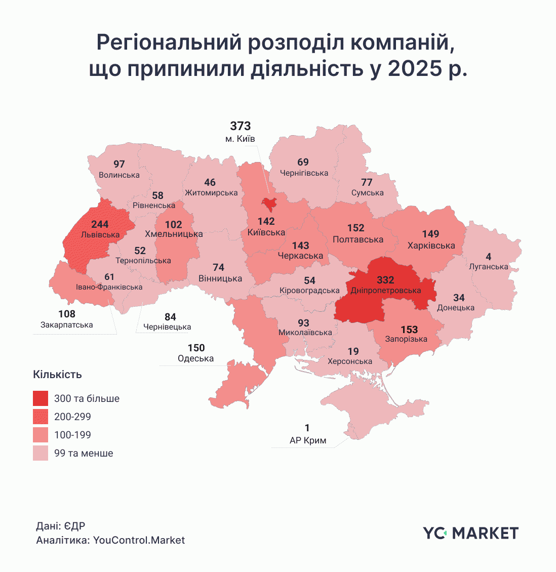 - больше всего компаний прекратили деятельность в Киеве, Днепропетровской, Львовской, Запорожской и Полтавской областях. Наименьшее количество прекращений зафиксировано в Херсонской области, Донецкой, Житомирской, Тернопольской, Кировоградской и Ровенской областях.