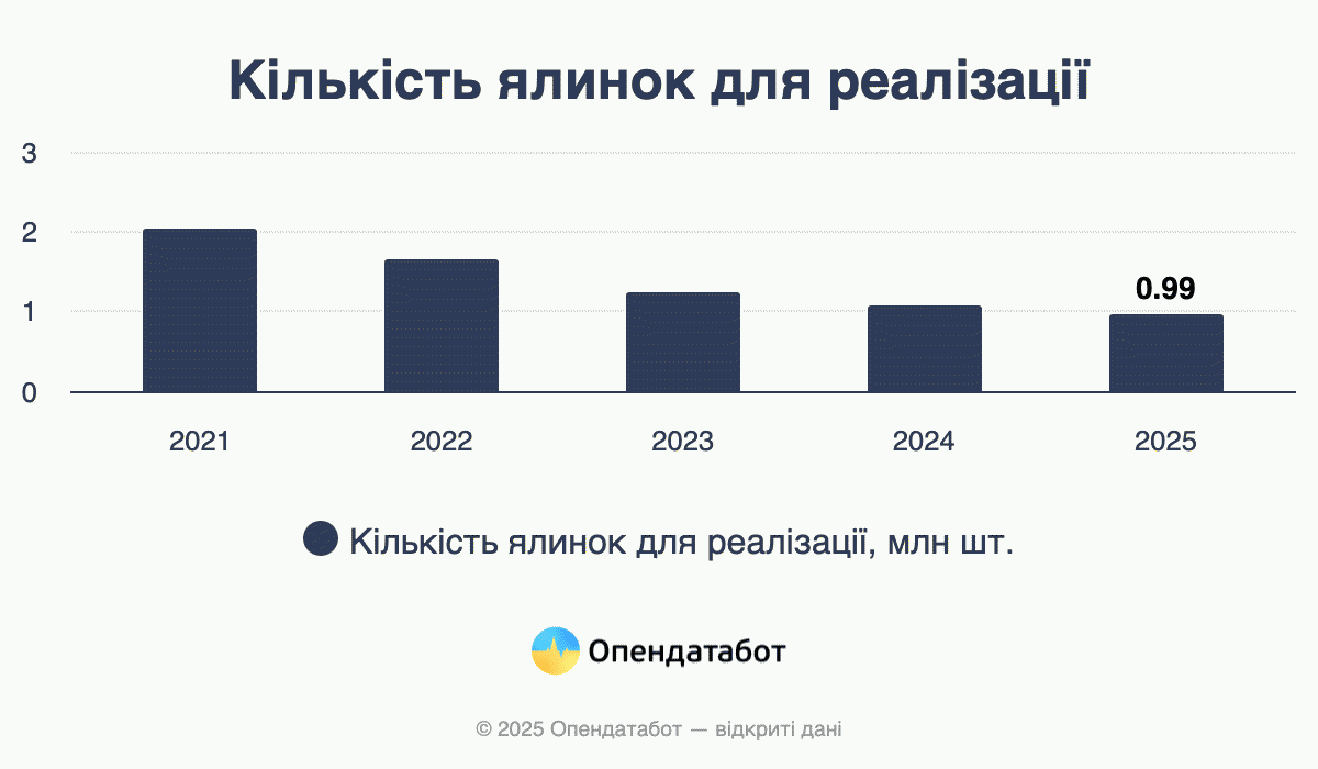 Впрочем, спрос на живые новогодние деревья падает еще быстрее, чем предложение. Так, только 39,9 тысячи елок продали в Украине по состоянию на середину декабря 2025 года. Это на 11% меньше, чем за аналогичный период прошлого года. Для сравнения, за весь предыдущий сезон лесхозы реализовали 153,7 тысячи деревьев — это на 38% меньше, чем в сезоне 2023–2024, и почти на четверть меньше, чем в 2022–2023 годах.