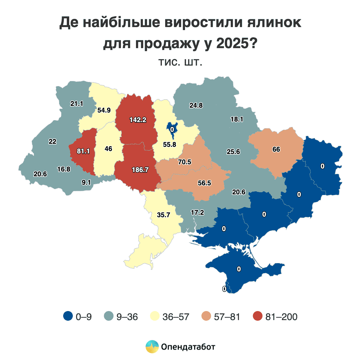 Наибольшие объемы праздничных деревьев для реализации в этом сезоне сосредоточены в двух регионах: Винницкая область — 187 тысяч елок, или 19% от общего количества, и Житомирская область — 142 тысячи, или 14%. В то же время именно Житомирская область остается лидером по площади земель под выращивание хвойных — 640 гектаров. Это почти четверть от общеукраинской площади. За четыре года она сократилась здесь на 9%, но даже на этой территории растет около 1,9 миллиона деревьев.