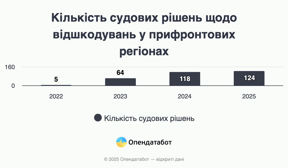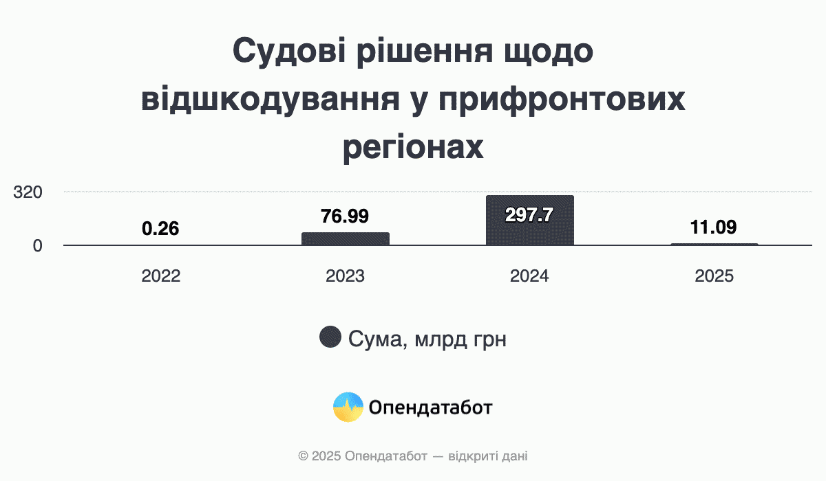 В 2022 году было принято только 5 таких решений, однако уже за год их количество выросло в десять раз. А за неполный текущий год суды уже вынесли 124 решения. Вместе с количеством растут и суммы требований. Так, в первый год полномасштабного бизнеса присудили компенсировать только 260 млн грн, а уже в 2023-м сумма решений судов выросла до почти 77 млрд грн. Абсолютный пик пришелся на 2024 год — более 297 млрд грн. В этом году сумма решений снизилась до 11 млрд грн.