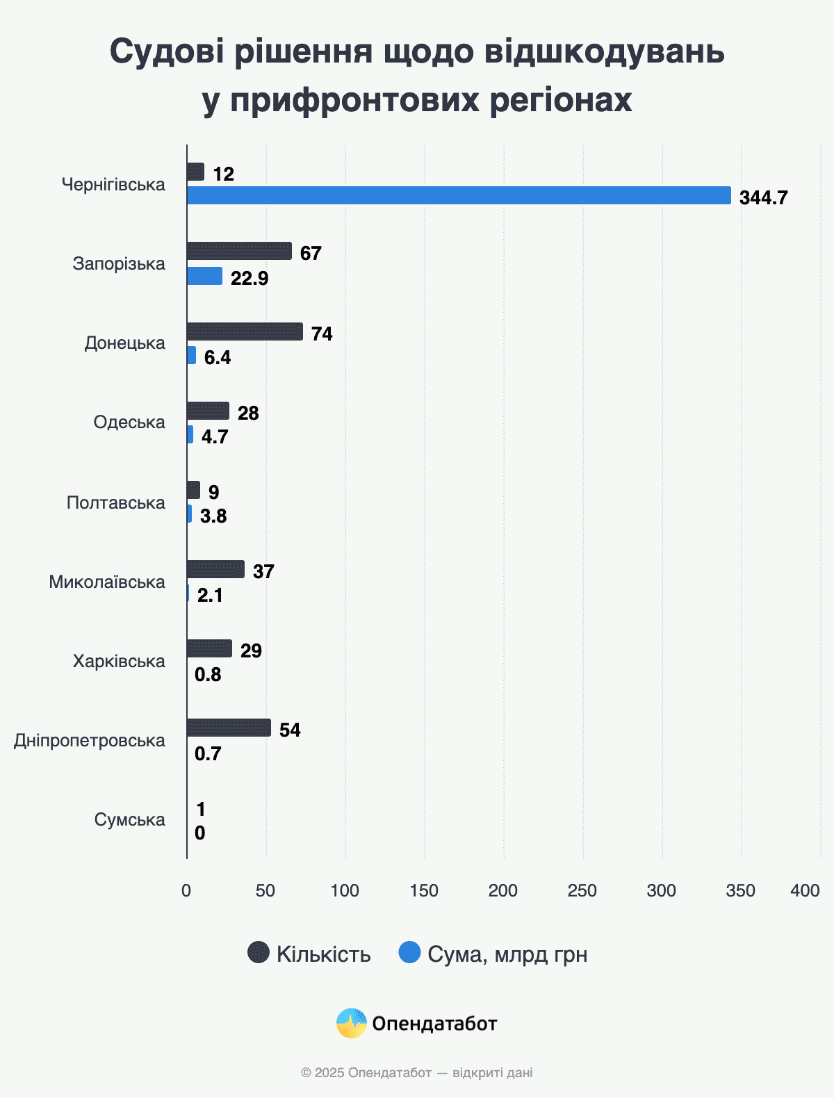 Собственно, благодаря этому судебному решению именно Черниговская область с 344,7 млрд грн возглавила рейтинг регионов по общей сумме удовлетворенных исков, значительно опередив другие области. Для сравнения, в Запорожской области общая сумма взысканий составляет 22,9 млрд грн, в Донецкой — 6,36 млрд, в Одесской — 4,68 млрд.