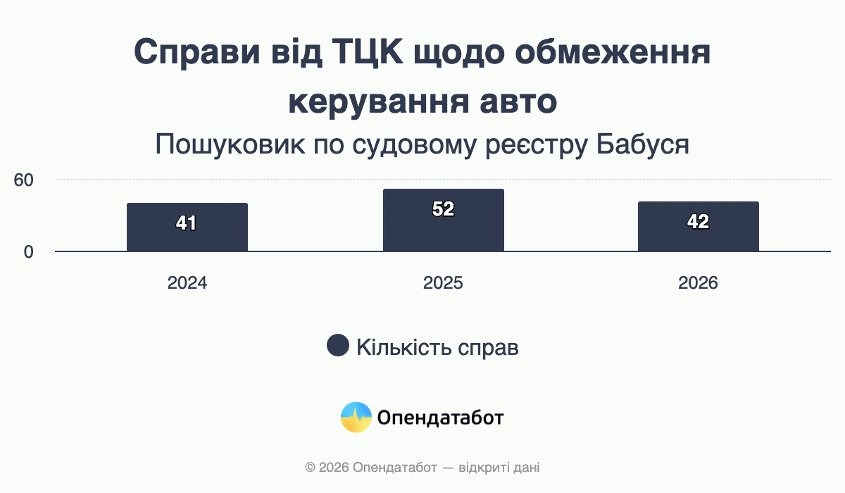 135 дел по искам ТЦК об ограничении права управления автомобилем на данный момент зафиксировано в Украине по данным поисковой системы по судебному реестру «Бабуся». 42 дела были возбуждены в этом году — это уже больше, чем за весь 2024 год. Текущий год рискует в целом стать рекордным, ведь за весь 2025 год таких дел было всего 52.