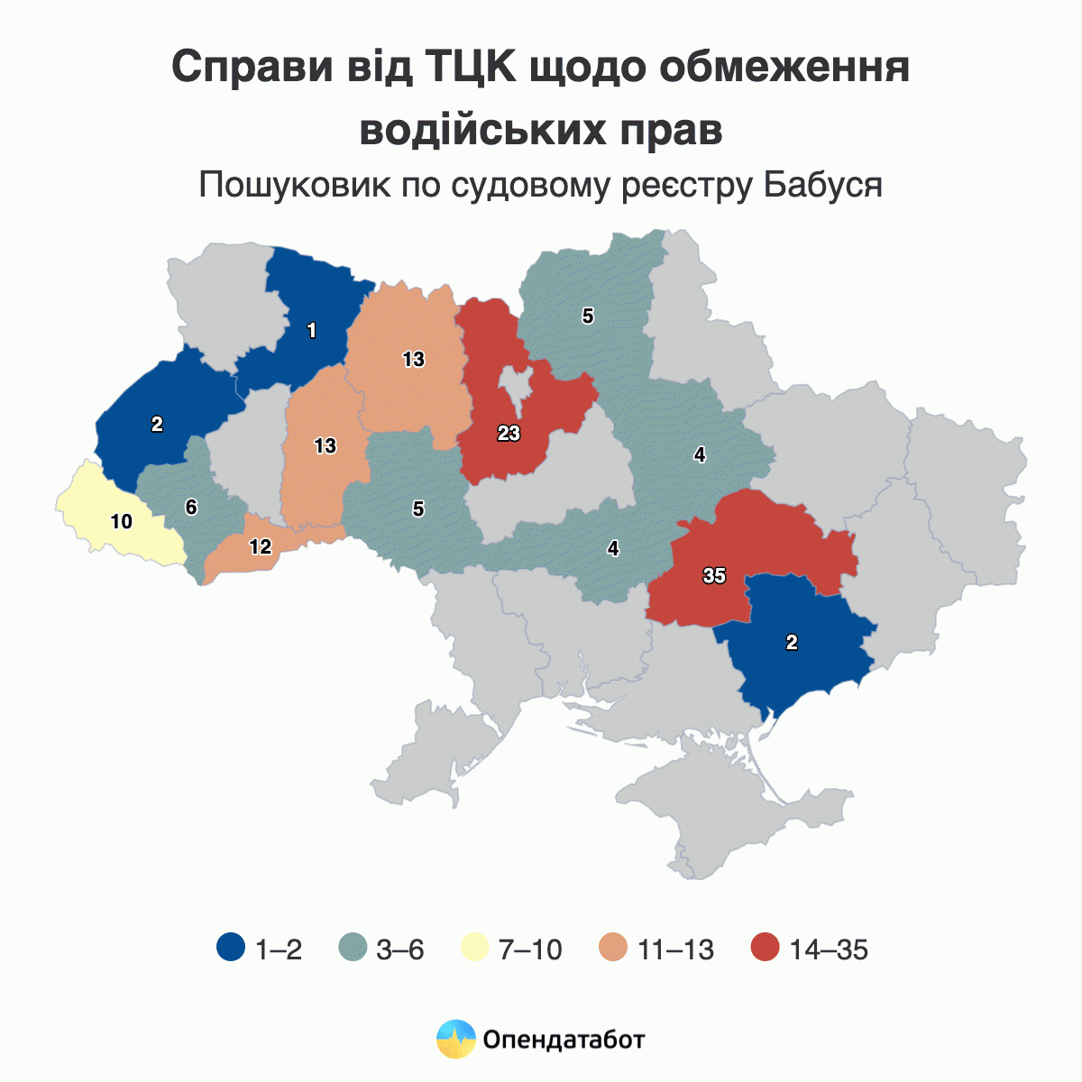 Больше всего исков от ТЦК подано в Днепропетровской области — 35 дел. Это более четверти от общего количества. Далее следует Киевская область с 23 делами, а Хмельницкая и Житомирская области имеют по 13 дел каждая. В некоторых областях ТЦК вообще не пытаются лишить нарушителей правил воинского учета возможности управлять автомобилем: в частности, в прифронтовых регионах, Волынской, Николаевской, Тернопольской, Одесской, Черкасской областях и в Киеве.