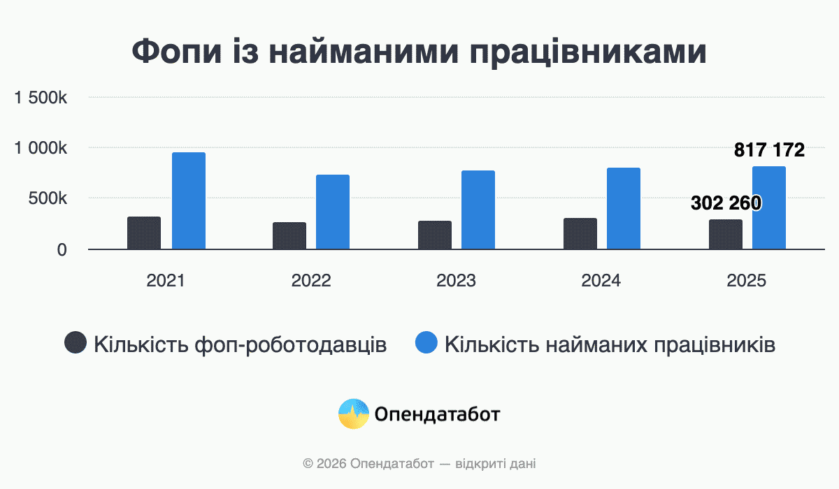 По данным Государственной налоговой службы, в 2025 году в Украине у ФЛП работали более 817 тысяч украинцев. Всего 302 тысячи предпринимателей имели наемных работников в Украине в прошлом году. Сейчас каждый седьмой предприниматель создает рабочие места. Больше всего ФЛП-работодателей в Днепропетровской области, а больше всего наемных сотрудников — во Львовской области.