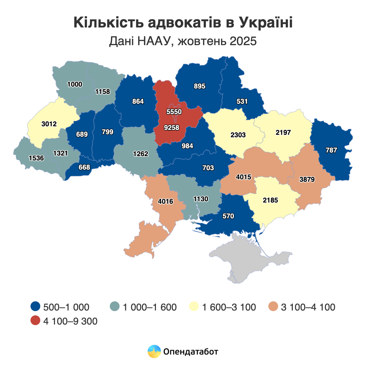 Больше всего адвокатов зарегистрировано в Киевской области: 9 258 или 18%, в столице — 5 550 или 11%. Третье место по востребованности специалистов адвокатуры поделили Одесская область (4 016) и Днепропетровская область (4015).
