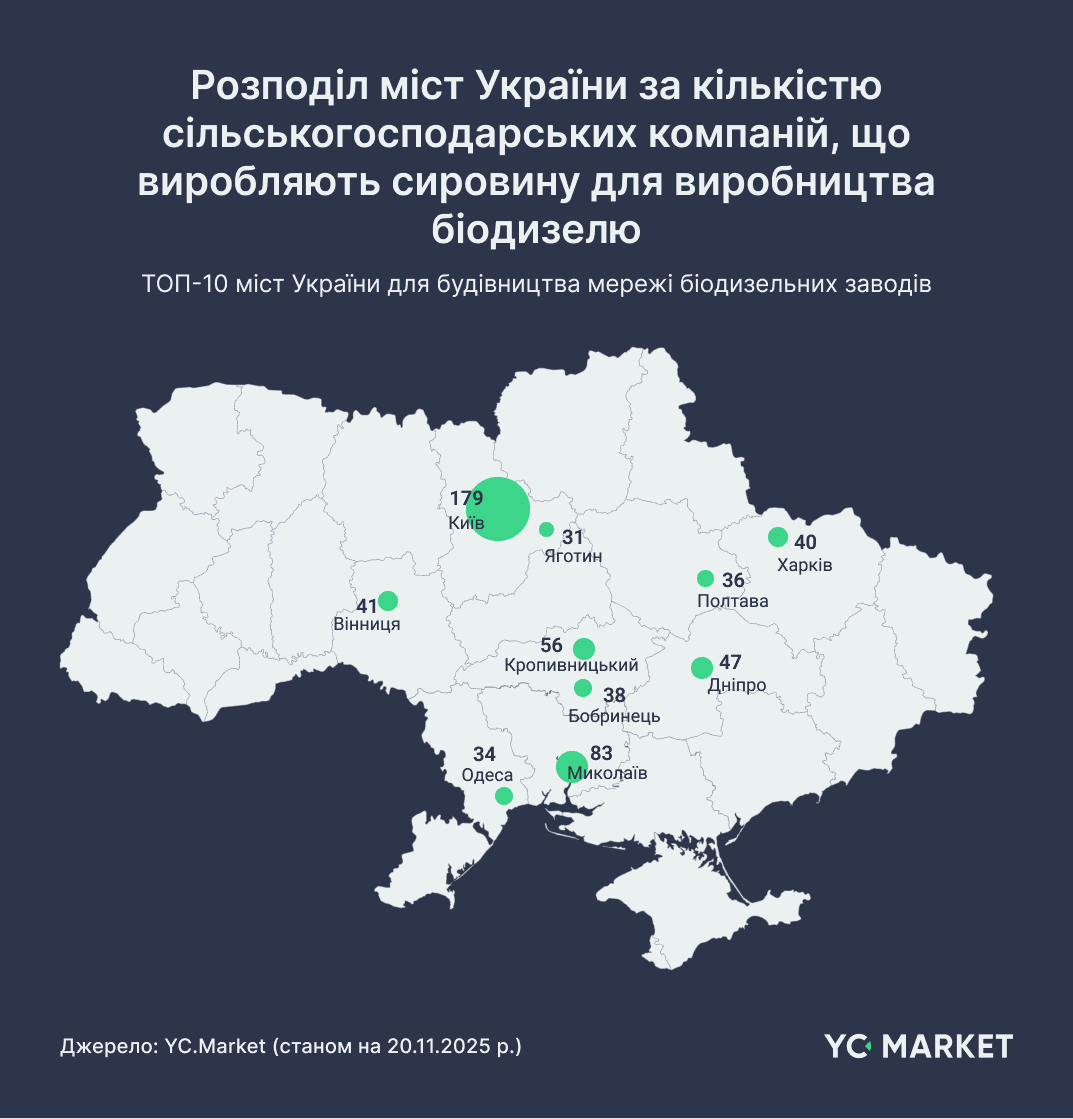 В межах проведеного аналізу також визначено ТОП-10 українських міст, де зосереджено найбільше агропідприємств – потенційних постачальників сировини для біодизельних заводів. Лідером очікувано є м. Київ – у столиці зареєстровано 179 відповідних компаній (багато штаб-квартир великих агрохолдингів і трейдерів). Далі йдуть південні портові та центри агрорегіонів: Миколаїв (83 компанії) і Кропивницький (56). На 4–5 місцях розташувалися Дніпро (47) та Вінниця (41). До десятки також входять Харків (40), невелике місто Бобринець на Кіровоградщині (38), Полтава (36), Одеса (34) та Яготин у Київській області (31). Така присутність навіть районних центрів (як Бобринець, Яготин) пояснюється високою аграрною активністю в навколишніх районах і наявністю там операторів з вирощування олійних культур.