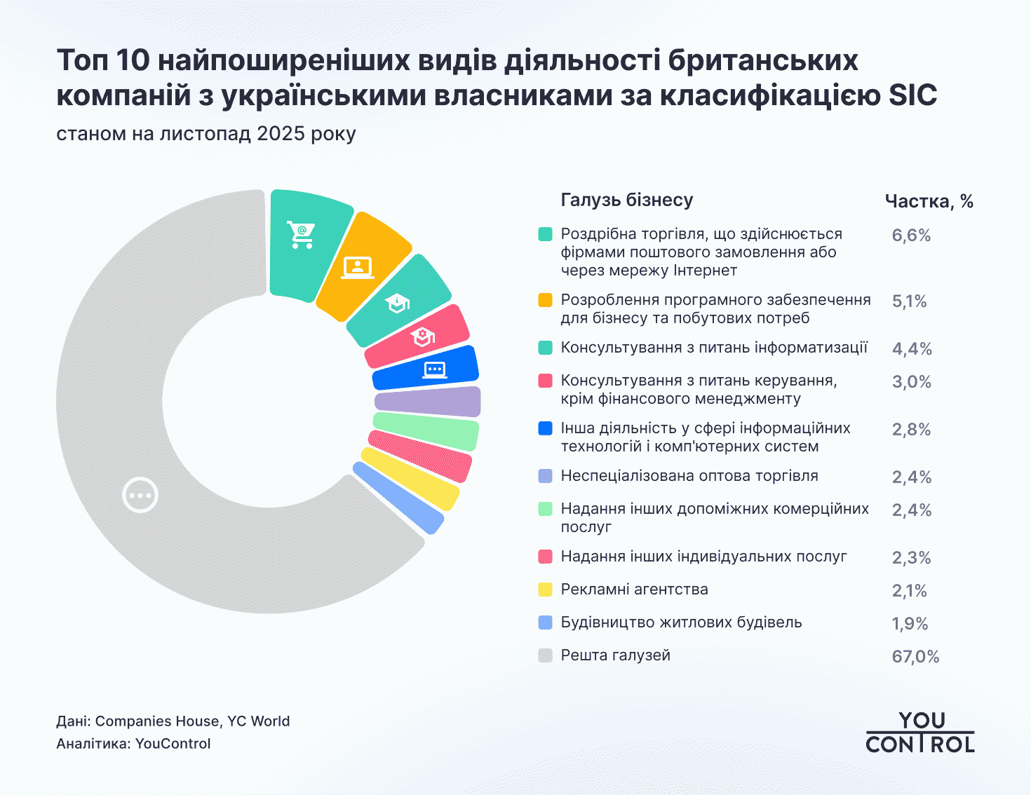 Аналіз галузевої структури британських компаній, що належать українцям, демонструє виразний фокус на цифрову економіку та сферу професійних послуг, де лідируючу позицію посідає роздрібна торгівля через мережу інтернет або поштові замовлення, охоплюючи 6,6% від загальної кількості (3079 компаній).