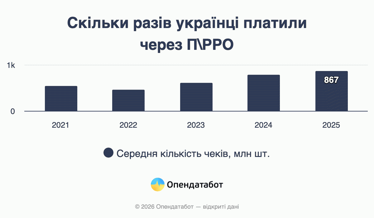 Грошей у чеках теж стає більше. Так, 5,67 трлн грн пройшло через П/РРО у 2025 році. Це на 28% більше, ніж роком раніше. У 2024-му зростання було рекордним: +73%.