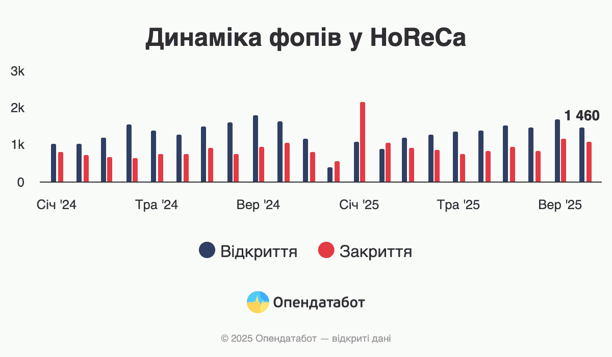 Водночас за той самий період свою роботу припинили 10 645 фопів у сфері кафе та ресторанів. Загалом цьогоріч приріст нових підприємців склав +2 728 заклади. До порівняння, торік приріст склав 6 004 нових справ.