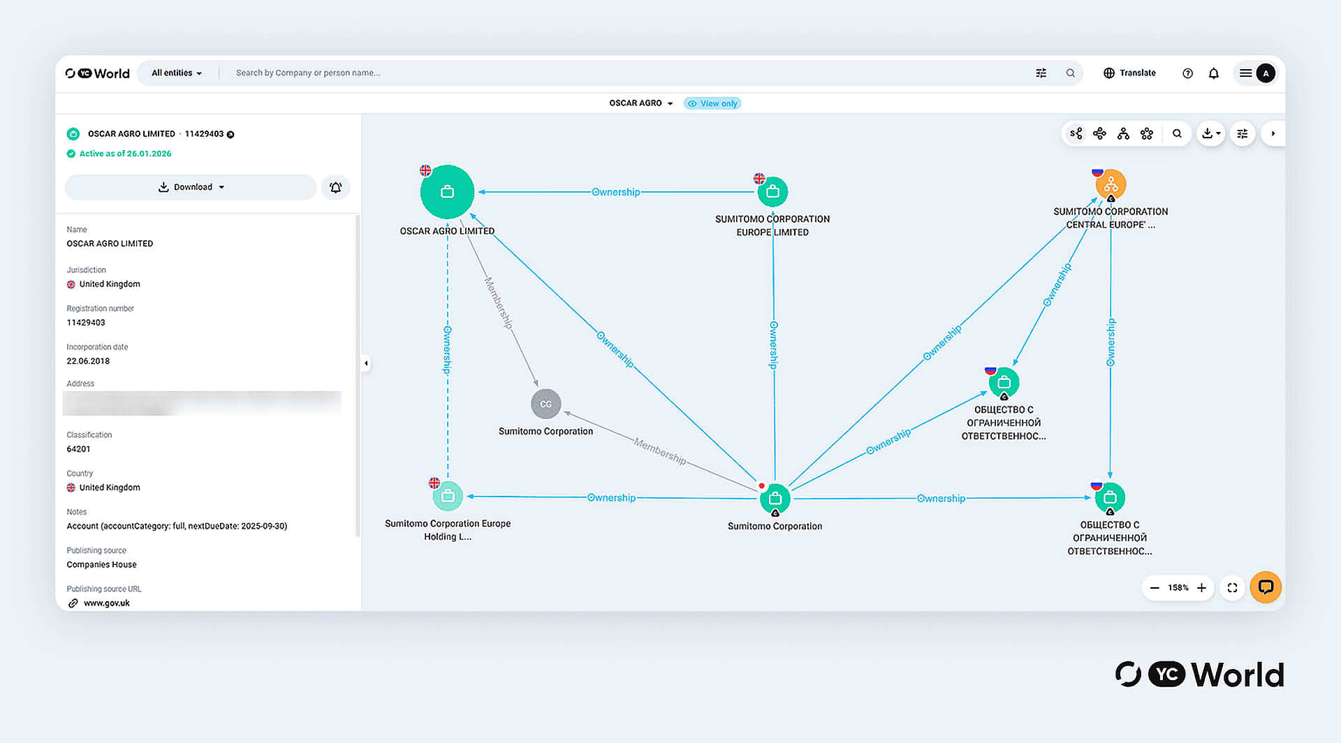 Перевірити міжнародні зв’язки компанії OSCAR AGRO LIMITED можна за допомогою міжнародної платформи для глобального пошуку та візуалізації бізнес-зв’язків YC World від YouControl, що допомагає розкривати приховані інсайти. Наприклад, фактори ризику, пов’язані зі зв’язками цього об'єкта, зокрема сліди ризикових країн, куди за замовчуванням додані такі країни як: росія, Білорусь, Іран, Куба, Північна Корея, Сирія, Китай. В такому випадку, вищезгадана британська аграрна компанія має ймовірний зв’язок з росією та історичний зв’язок з Китаєм.