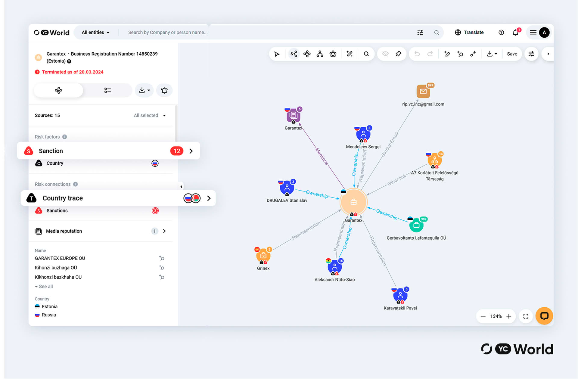 Перевірити міжнародні зв’язки компанії Garantex можна за допомогою міжнародної платформи для глобального пошуку та візуалізації бізнес-зв’язків YC World від YouControl, що допомагає розкривати приховані інсайти. Наприклад, фактори ризику, пов’язані зі зв’язками цього об'єкта, зокрема сліди ризикових країн, куди за замовчуванням встановлені такі країни як: Росія, Білорусь, Іран, Куба, Північна Корея, Сирія, Китай. В даному випадку, вищезгадана компанія має ймовірні зв'язки з російськими юридичними та фізичними особами.