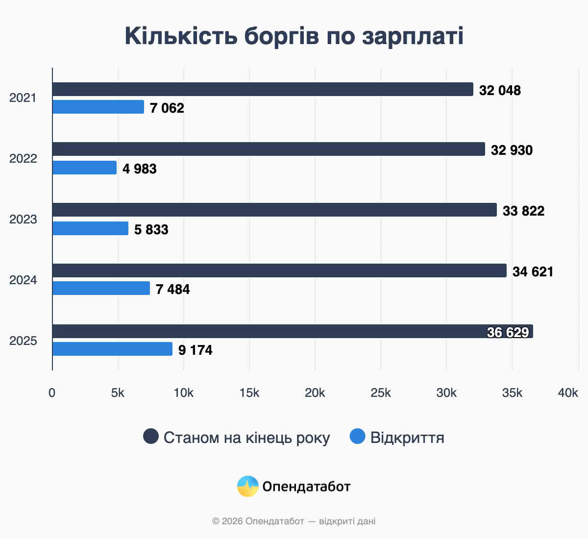 Понад 36,6 тисячі боргів по заробітній платі зафіксовано на початок 2026 року за даними Єдиного реєстру боржників. За рік боргів побільшало на 6%. Майже 2 тисячі справ беруть початок ще у 2017 році. Рекордні 9,1 тисячі проваджень щодо боргів по зарплаті було відкрито торік. Це на 30% більше, ніж у 2024 році. Понад чверть боргів припадає на компанії, що працюють у сфері виробництва хімпродукції. У антилідерах Дніпропетровщина — понад третина усіх боргів по зарплаті.
