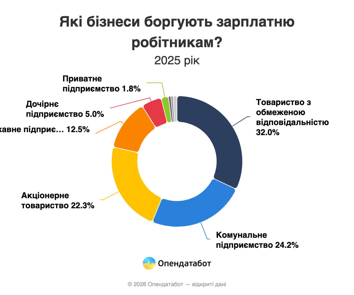 Переважно, гроші затримують приватні компанії: 62% усіх боргів за 2025 рік. Ще чверть справ стосується комунальних підприємств і понад 13% — державних. Найчастіше фігурують товариства з обмеженою відповідальністю, комунальні та акціонерні підприємства.