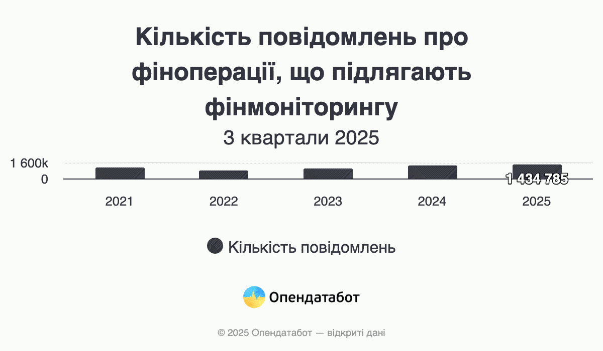 Після затишшя у перший рік повномасштабної повідомлень, які підпадають під фінмоніторинг, рік до року лише більшає: лише у 2024 обсяг їх обсяг зріс одразу на 22%. Цьогоріч, у середньому, щомісяця надходить близько 160 тисяч повідомлень.