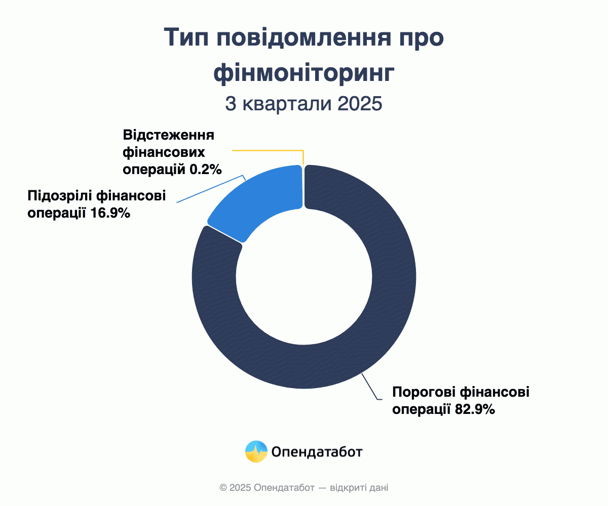 Переважна більшість повідомлень — 99% — від банків: 1,42 млн звітів. Небанківські установи передали ще майже 15 тисяч. Основна маса повідомлень стосується порогових фінансових операцій — понад 1,18 млн (83%). Підозрілих операцій значно менше — близько 243 тисяч (17%). Решта — це повідомлення, надіслані у відповідь на запити щодо відстеження, а також комбіновані звіти, що одночасно стосуються і порогових, і підозрілих операцій.