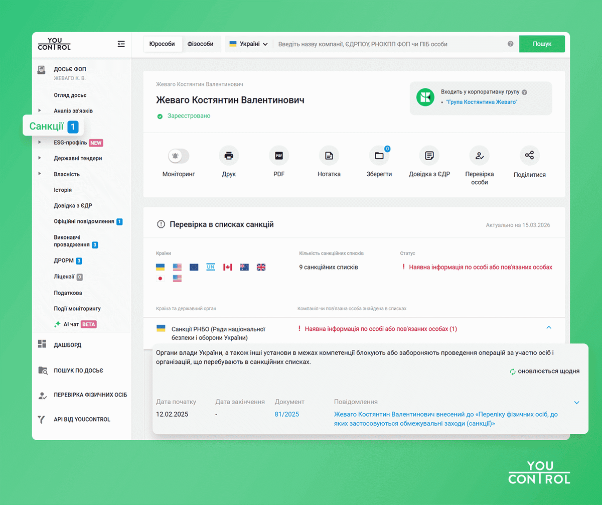 Скріншот з системи YC World, візуалізація наявності санкцій у фізичної особи