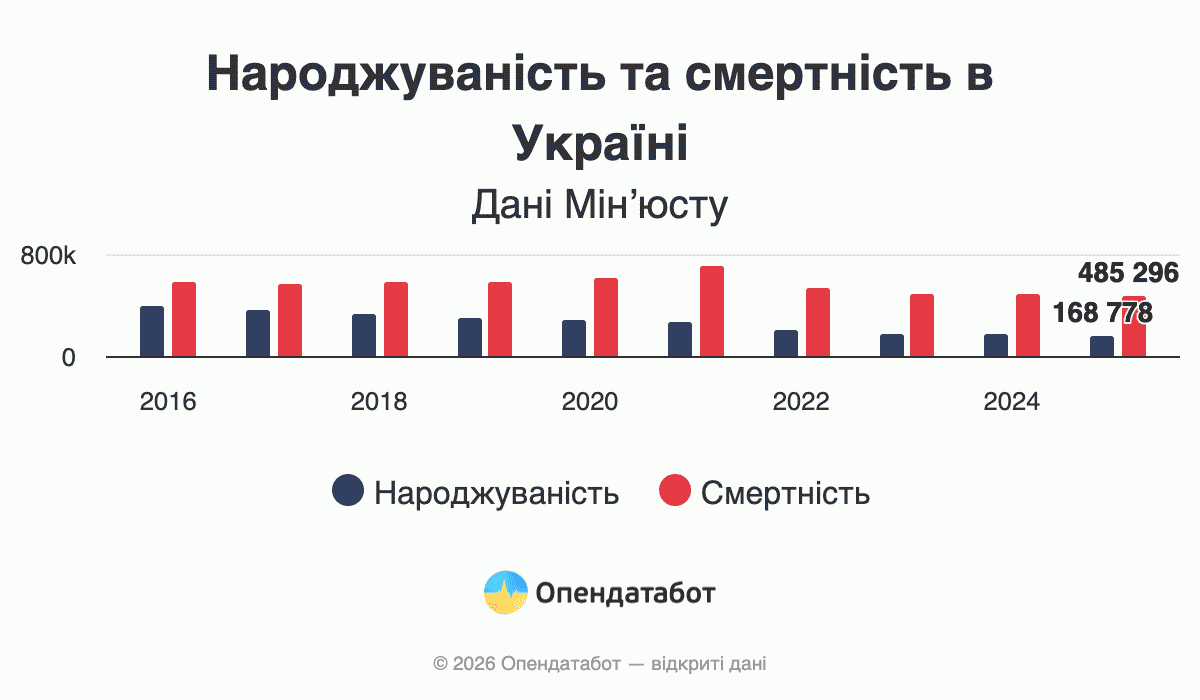Більш ніж 168,7 тисячі дітей народилось в Україні у 2025 році за даними Міністерства юстиції України. Водночас зафіксовано 485,2 тисячі смертей. Загалом на одного новонародженого торік припадало троє померлих. За рік смертність в Україні скоротилась на 2%, а народжуваність — на 4,5%.