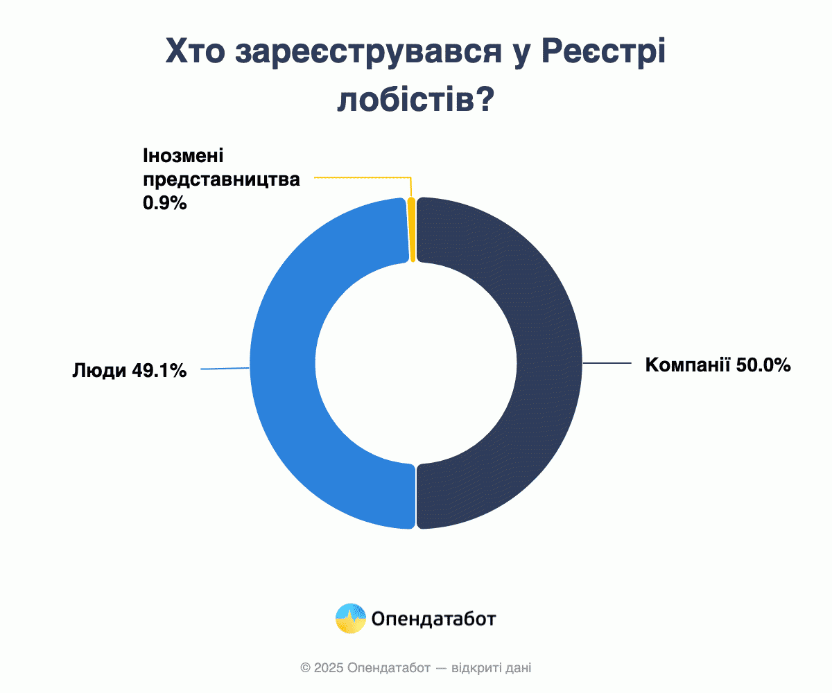 Перші засвідчені державою лобісти з'являються в Україні. 110 учасників з'явились у відповідному Реєстрі, яким опікується НАЗК, станом на кінець листопада — тобто за три місяці відтоді, як набув чинності Закон про лобіювання. Серед них 55 компаній, 54 людини та 1 іноземне представництво. Опендатабот проаналізував, навіщо такий Реєстр та як він вплине на бізнес та державу.