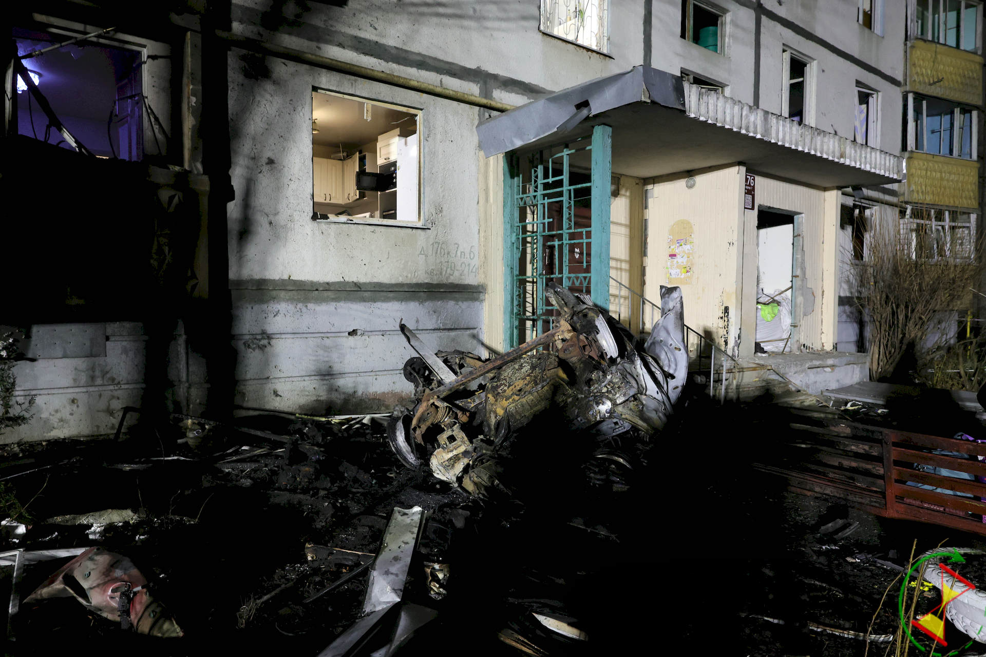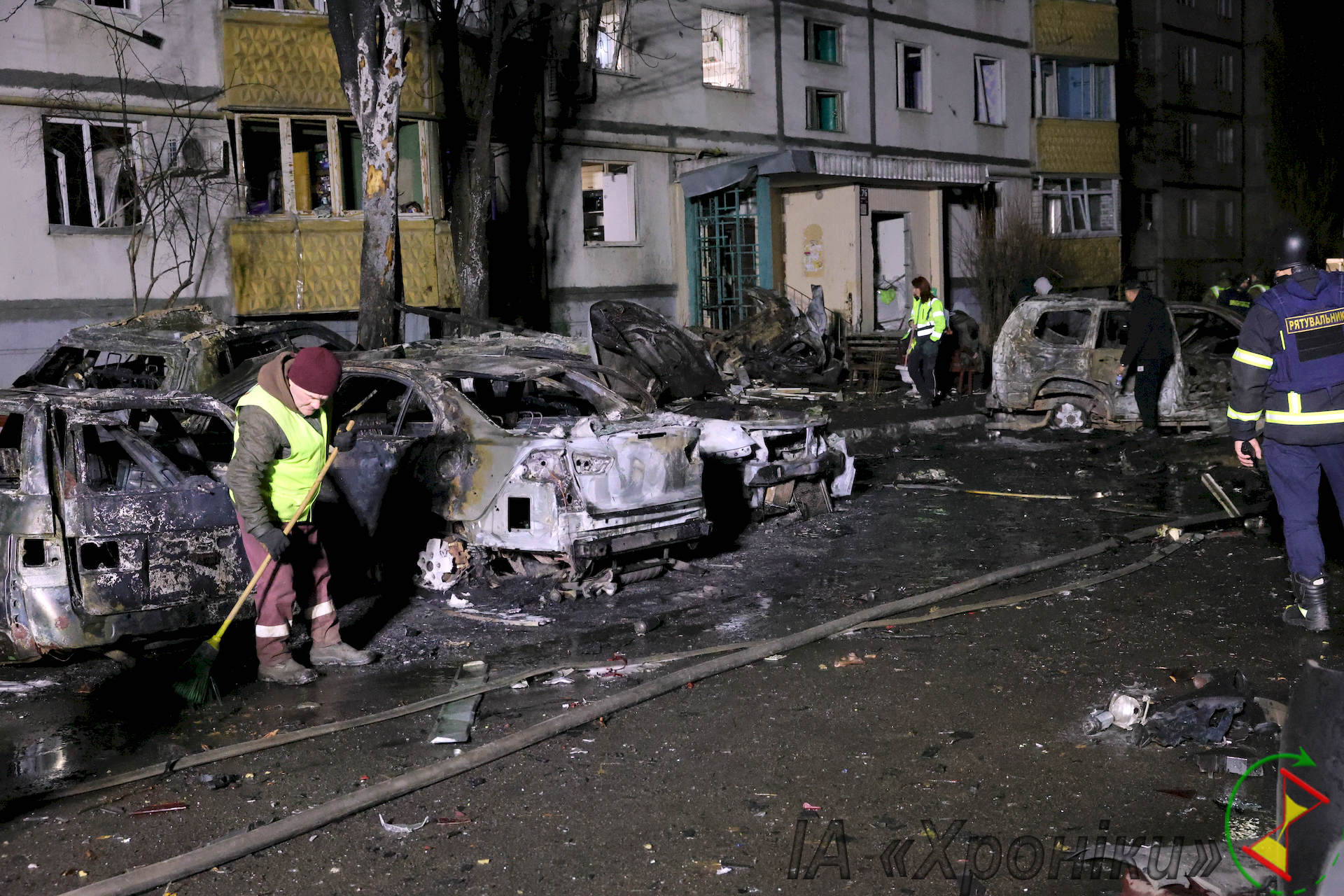 На початку першої години ночі росіяни вдарили по Харкову дюжиною безпілотників, руйнуючи багатоповерхівки, лікарню, шкільне подвір'я, супермаркет і спаливши не менше зесятка автомобілів.