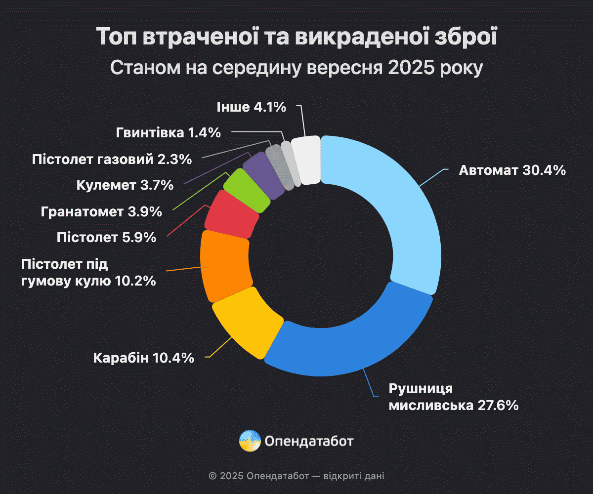 Более 491 тысячи единиц оружия было утрачено и похищено с начала полномасштабной войны в Украине по данным Министерства внутренних дел. Потерянного оружия стало почти в 2 раза больше за последний год — с сентября 2024 года. Только 6% оружия было похищено, а львиная доля — утрачена. Чаще всего оружие теряют в Киеве, Донецкой и Николаевской областях.