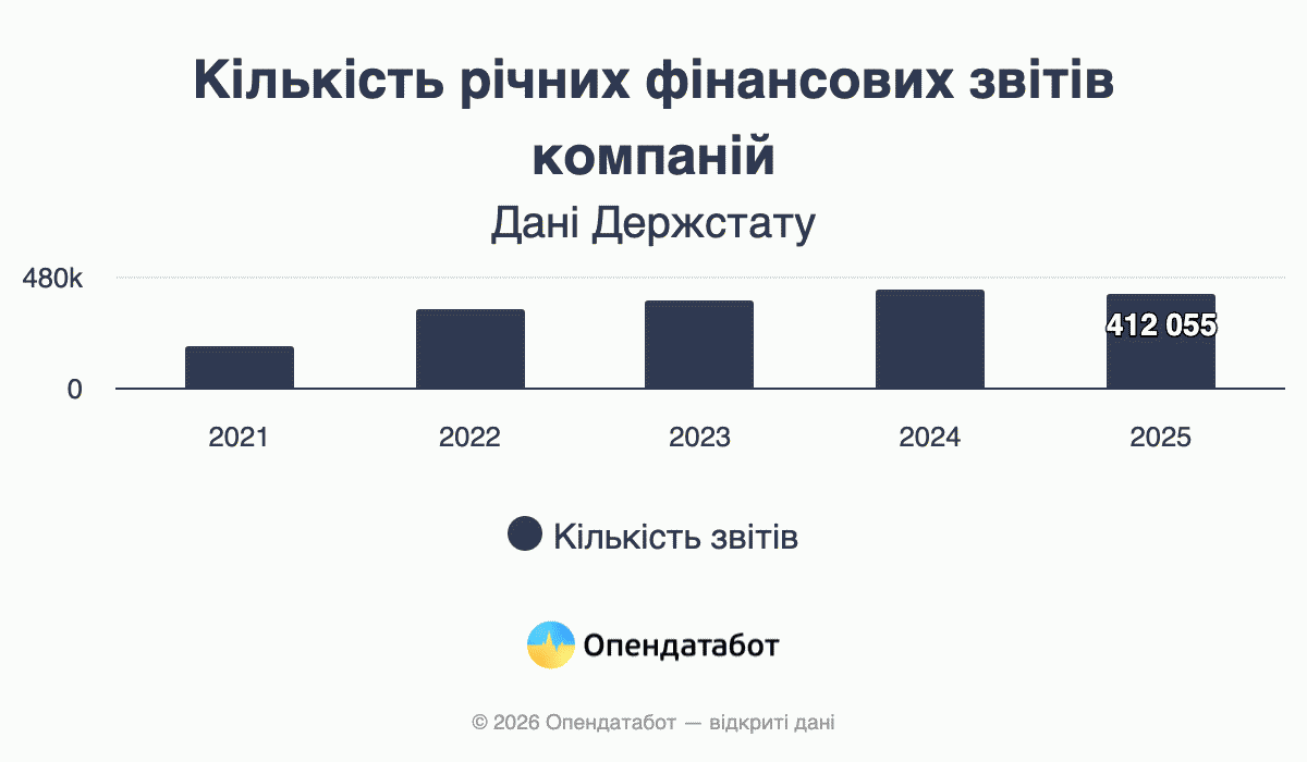 Из года в год все меньше компаний подают финансовую отчетность вовремя. Вероятно, это связано с тем, что в начале полномасштабного вторжения была отменена обязанность подачи отчетности. Впрочем, даже возвращение ответственности за эти данные не улучшило ситуацию: на данный момент подано 412 055 отчетов — на 4% меньше, чем в прошлом году.