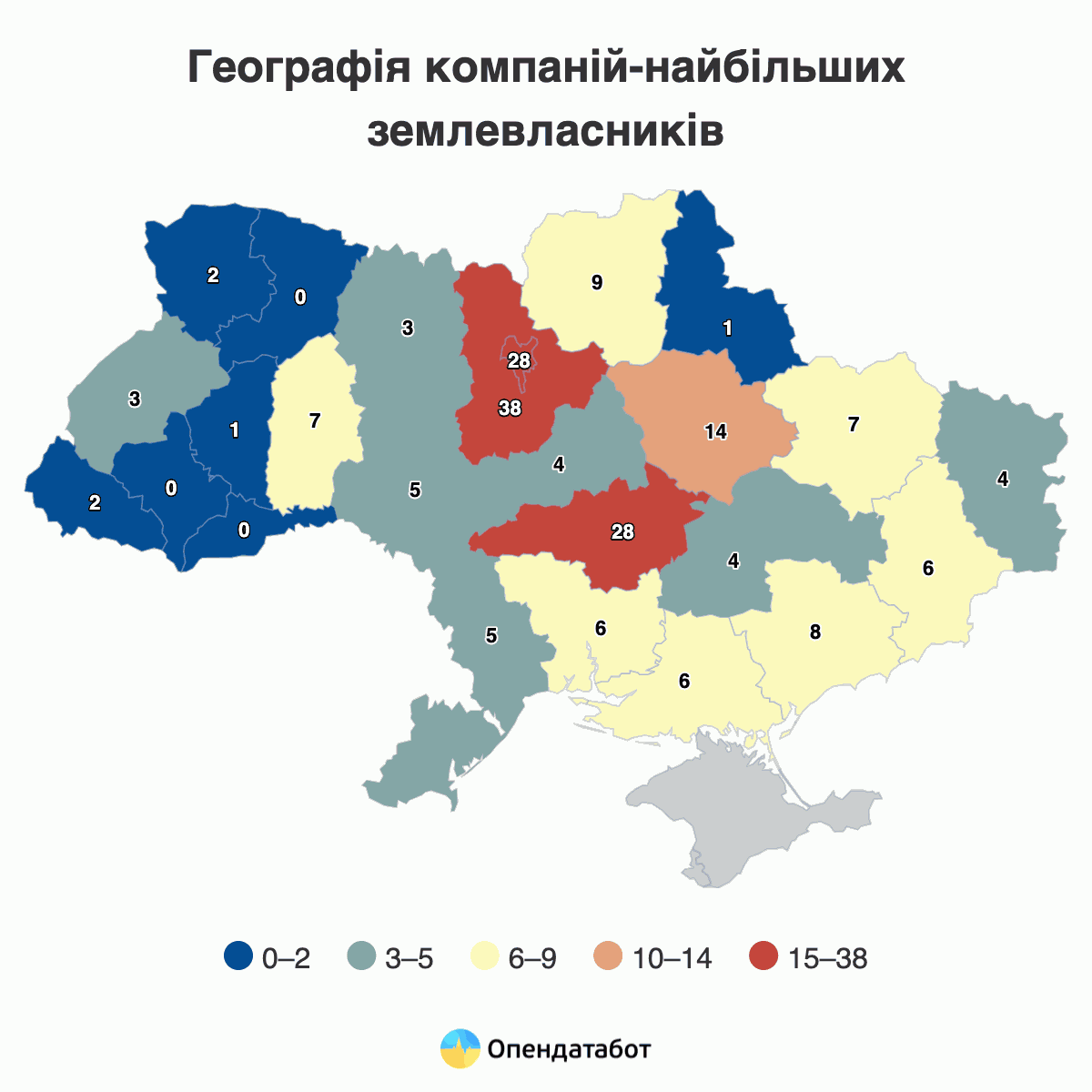 38 компаний из перечня крупных землевладельцев зарегистрированы в Киевской области. Еще 28 компаний зарегистрированы в Кировоградской области, и столько же — непосредственно в Киеве. В то же время в Ивано-Франковской, Ровенской и Черновицкой областях крупные землевладельцы среди компаний отсутствуют.