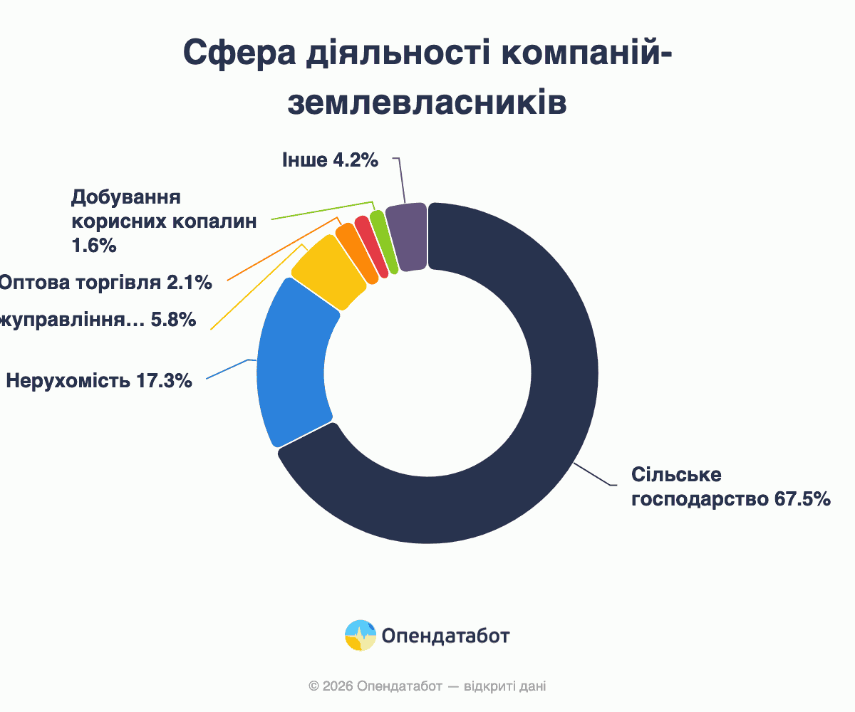 67% крупных землевладельцев работают в сфере сельского хозяйства — 129 компаний. Еще 33 компании, или 17%, связаны с операциями с недвижимостью. В сфере государственного управления и обороны работают 11 компаний, в оптовой торговле — 4, в финансовом секторе — 3 компании.