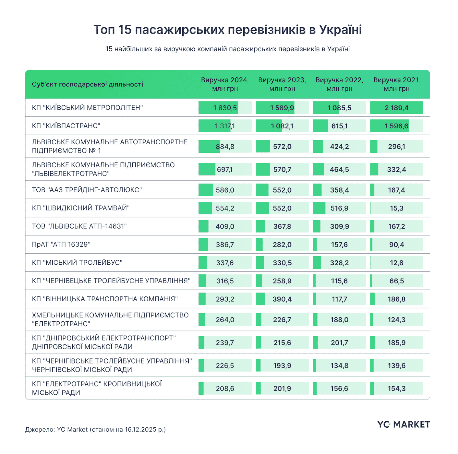 Как свидетельствуют данные системы YC.Market , топ-10 пассажирских перевозчиков по выручке демонстрирует высокую концентрацию официальных доходов в узком кругу операторов – преимущественно коммунальных или нескольких крупных частных междугородных компаний. Киевские и львовские муниципальные перевозчики стабильно входят в число лидеров, что логически обусловлено масштабом этих городских агломераций, регулярностью перевозок и бюджетной поддержкой, частично сглаживающей военные риски. В то же время, даже крупнейшие игроки (1–2,5 млрд грн выручки в год) генерируют относительно небольшие доходы по сравнению с объемом всего рынка. Например, совокупная годовая выручка топ-15 операторов в 2024 году составила около 8,3 млрд грн , то есть лишь 29% от расчетного рынка.