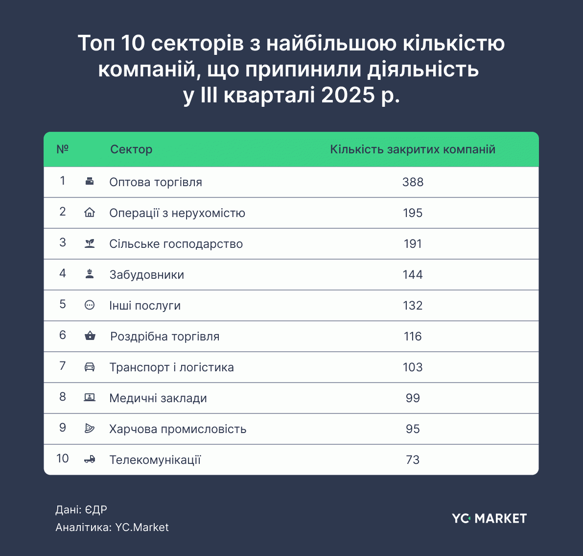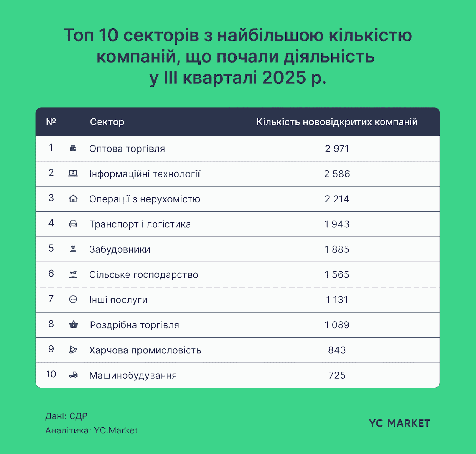 В третьем квартале 2025 года украинский бизнес активно регистрировали в сфере оптовой торговли — 2971 новая компания. Этот сектор традиционно удерживает лидерство благодаря своей широкой представленности в экономике. На втором месте – информационные технологии с 2586 новозарегистрированными компаниями, что отражает продолжение ИТ-экспансии даже в условиях военного времени. Замыкает тройку сектор операций с недвижимостью – 2214 новых регистраций бизнесов.