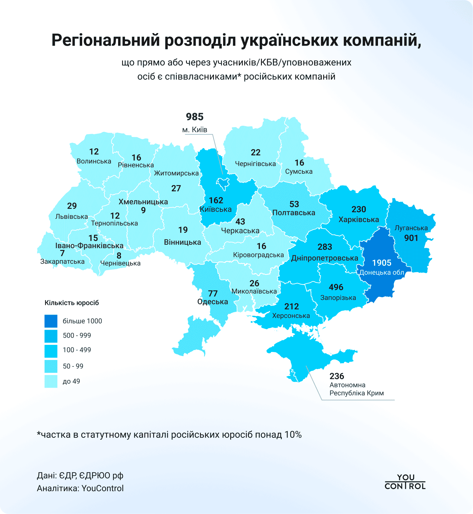 Специалисты YouСontrol изучили данные из Единого государственного реестра юридических лиц, физических лиц-предпринимателей и общественных формирований (далее — ЕГР) и Единого государственного реестра юридических лиц российской федерации (далее — ЕГРЮО РФ) и обнаружили наличие определенных связей с учётом 500 украинских с участием более 6 юрлиц, зарегистрированных в соответствии с российским законодательством. Как одна украинская компания или ФЛП могут иметь вероятную связь с несколькими российскими юридическими лицами одновременно, так и одно российское юрлицо может иметь связь с несколькими украинскими компаниями.