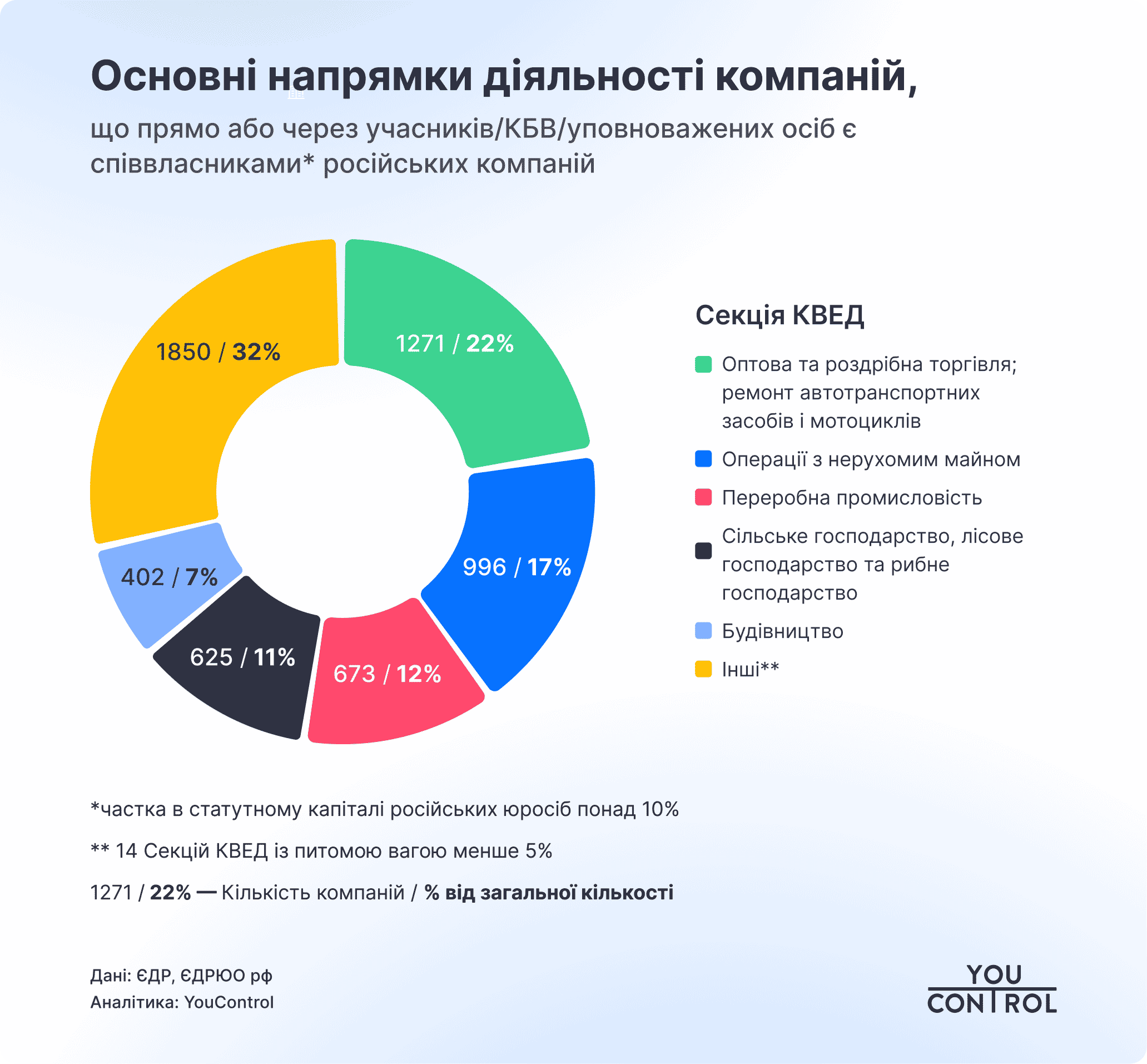 По состоянию на ноябрь 2025 года, 5 817 украинских компаний, вероятно, имеют связь с российскими юридическими лицами через участие в уставных капиталах как украинского юридического лица напрямую, так и через его участников, конечных бенефициаров и уполномоченных лиц.