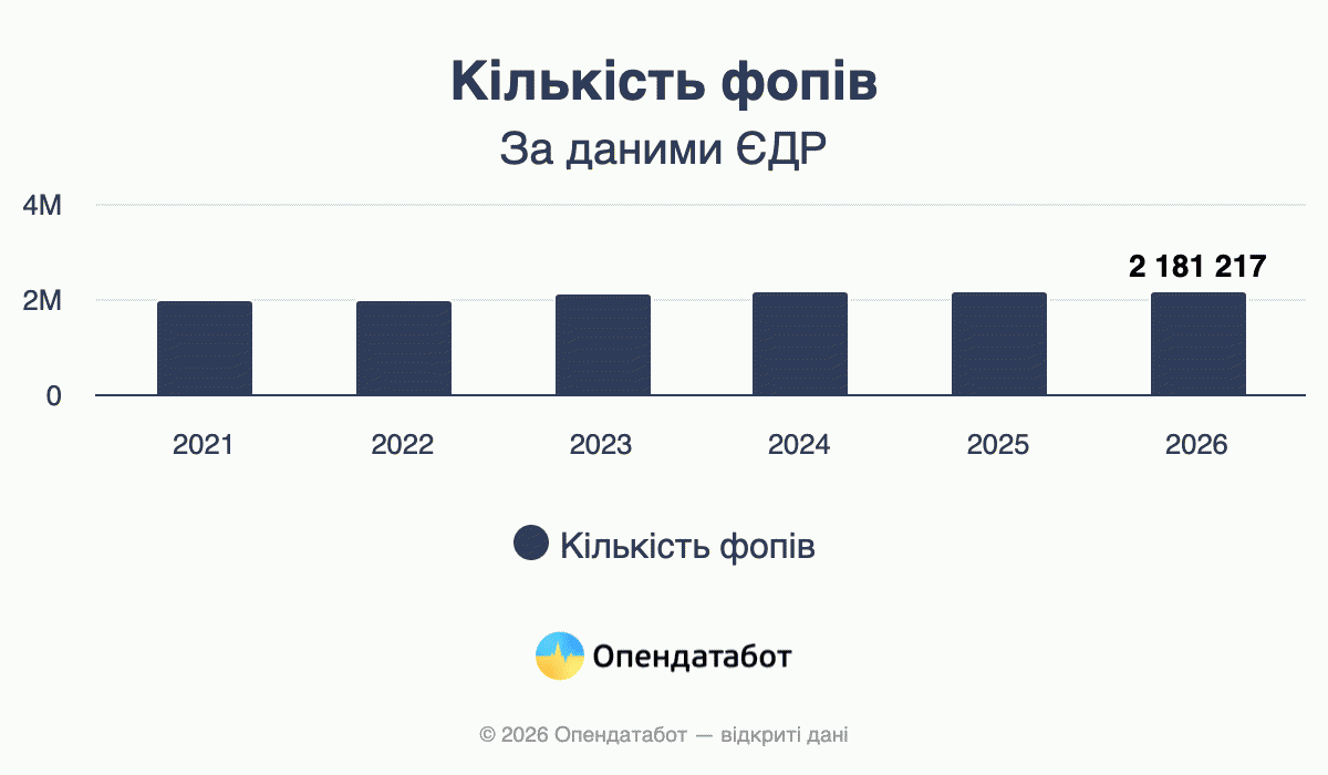 19 января 2026 года вступил в силу приказ Минюста, которым возобновлено обнародование информации из ЕГР о компаниях, ФЛП и общественных формированиях в форме открытых данных. Так, 2 181 217 ФЛП насчитывается в настоящее время в Украине. Менее чем за месяц ФЛП увеличилось на 6 тысяч.