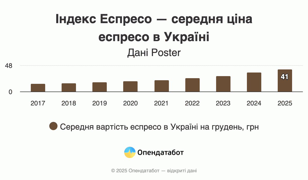 Кофе в Украине снова подорожал: 41 грн достигла средняя цена чашки эспрессо в декабре 2025 года. Это на 17% больше, чем в декабре прошлого года, когда чашку кофе можно было купить за 35 грн. В целом эспрессо подорожал почти в 2 раза с начала полномасштабной войны.