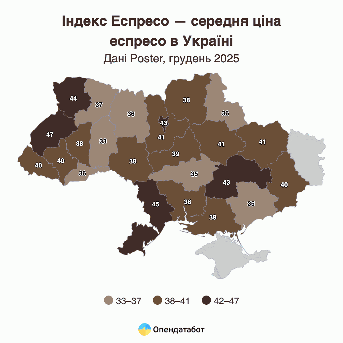 Самое дорогое эспрессо сейчас пьют на Львовщине — в среднем, 47 гривен за чашку. За год цена здесь выросла на 19%. Регион впервые за последние годы возглавил «кофейный рейтинг», вытеснив многолетнего южного лидера. Одесская область, которая два года подряд была рекордсменом по ценам на кофе, в декабре 2025 года оказалась на втором месте — 45 гривен за эспрессо.