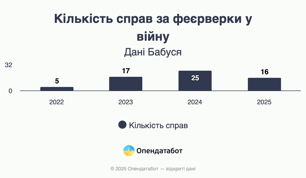 Феєрверки в Україні офіційно заборонені вже понад 2 роки, але запускати салюти під час війни українці не припинили. Так, 63 вироки за використання піротехніки винесли суди від початку повномасштабної за даними пошуковика по судовому реєстру Бабуся. З них 16 вироків було винесено станом на середину грудня 2025. Понад половину цих справ кваліфікують, як кримінальні, а порушники отримують реальні терміни за ґратами.