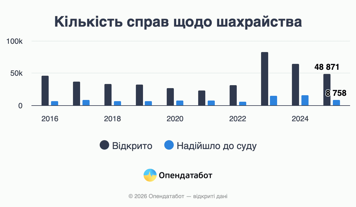 48 871 кримінальне провадження за статтею 190 ККУ «Шахрайство» зафіксовано в Україні у 2025 році. Це на чверть менше, ніж у 2024-му, коли правоохоронці зареєстрували майже 65 тисяч справ.