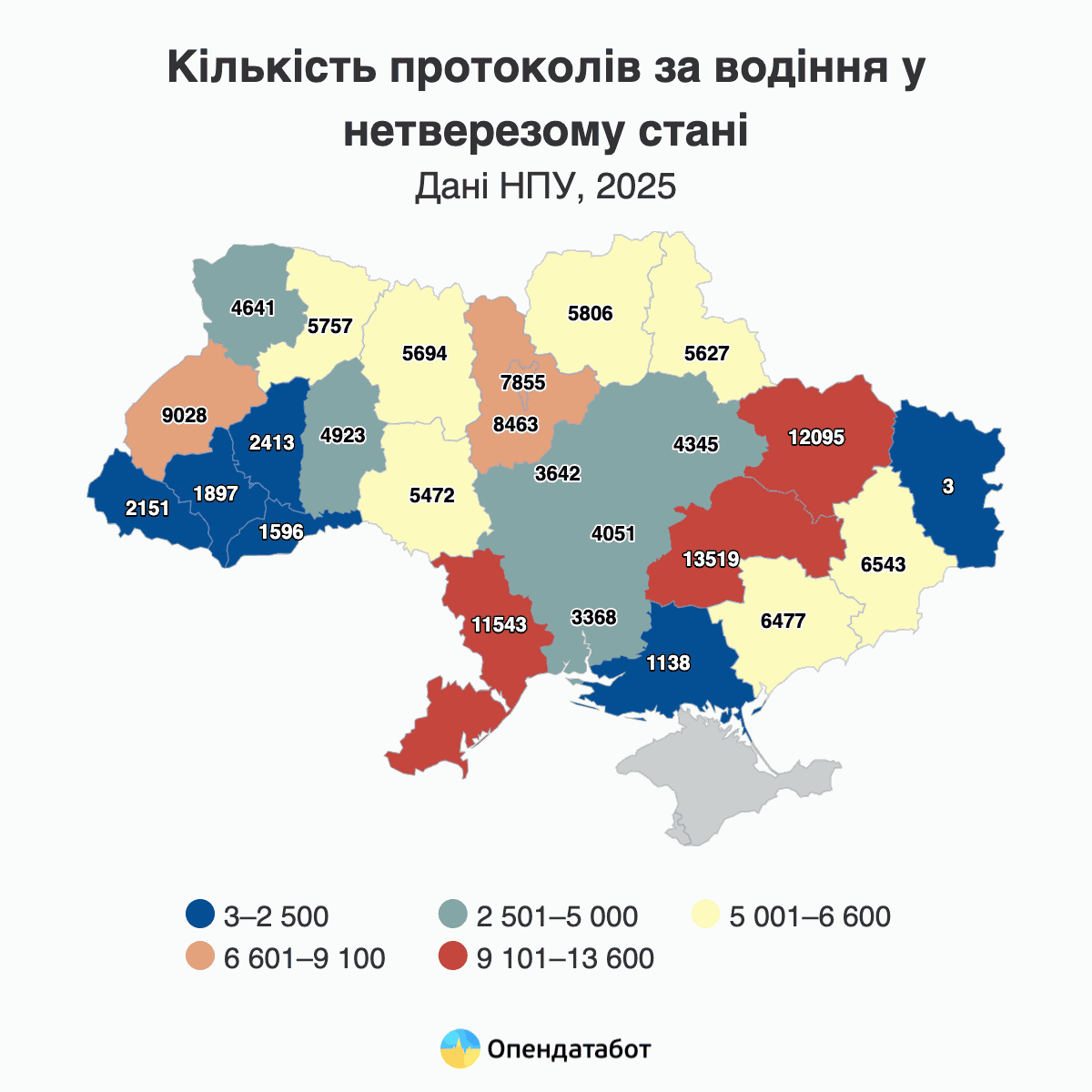 Загалом найбільше нетверезих водіїв зафіксовано на Дніпропетровщині — 13 519 випадків. До трійки антилідерів також потрапила Харківщина — 12 095 випадків та Одещина — 11 543 протоколи.