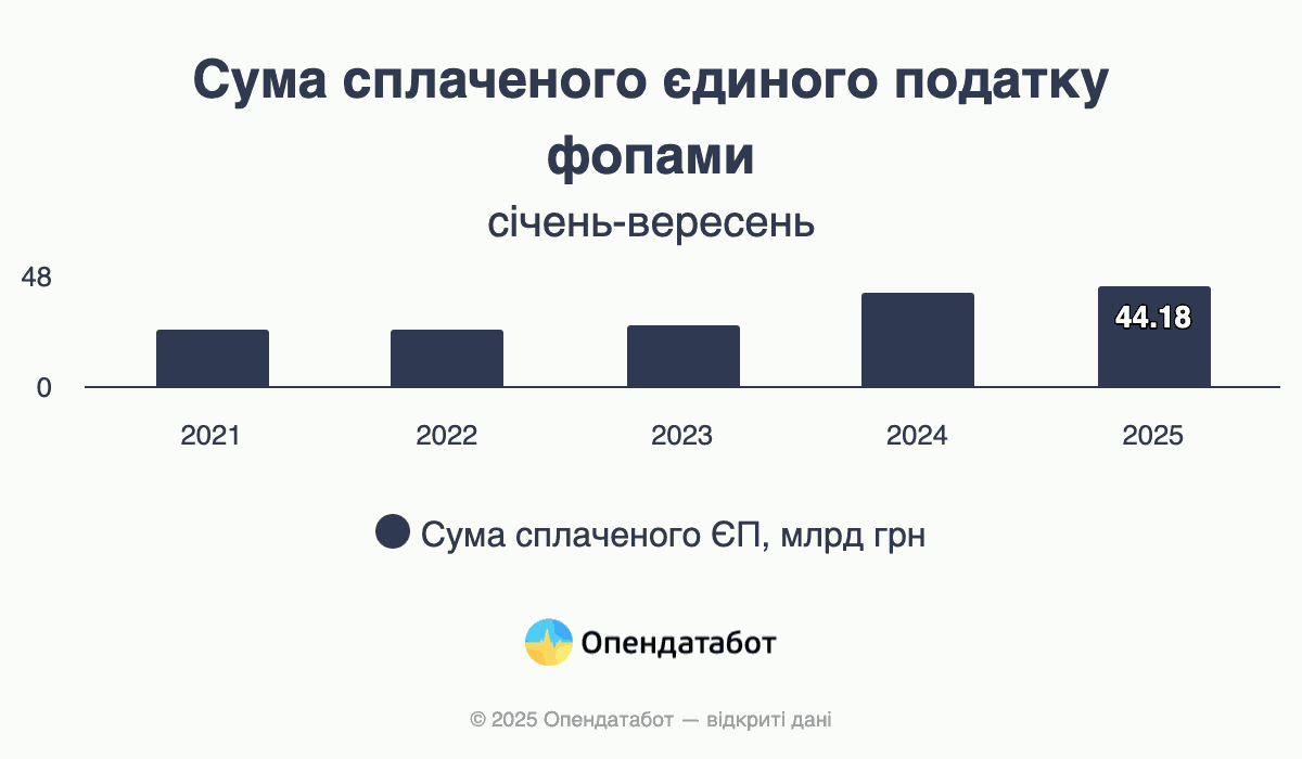 Понад 44 млрд грн єдиного податку сплатили фопи за 9 місяців 2025 року за даними Міністерства фінансів України. Це на 10% більше, ніж за аналогічний період торік та у 1,8 раза більше, ніж до початку повномасштабної. Наразі фопи сплатили 76% від запланованої суми єдиного податку на рік.