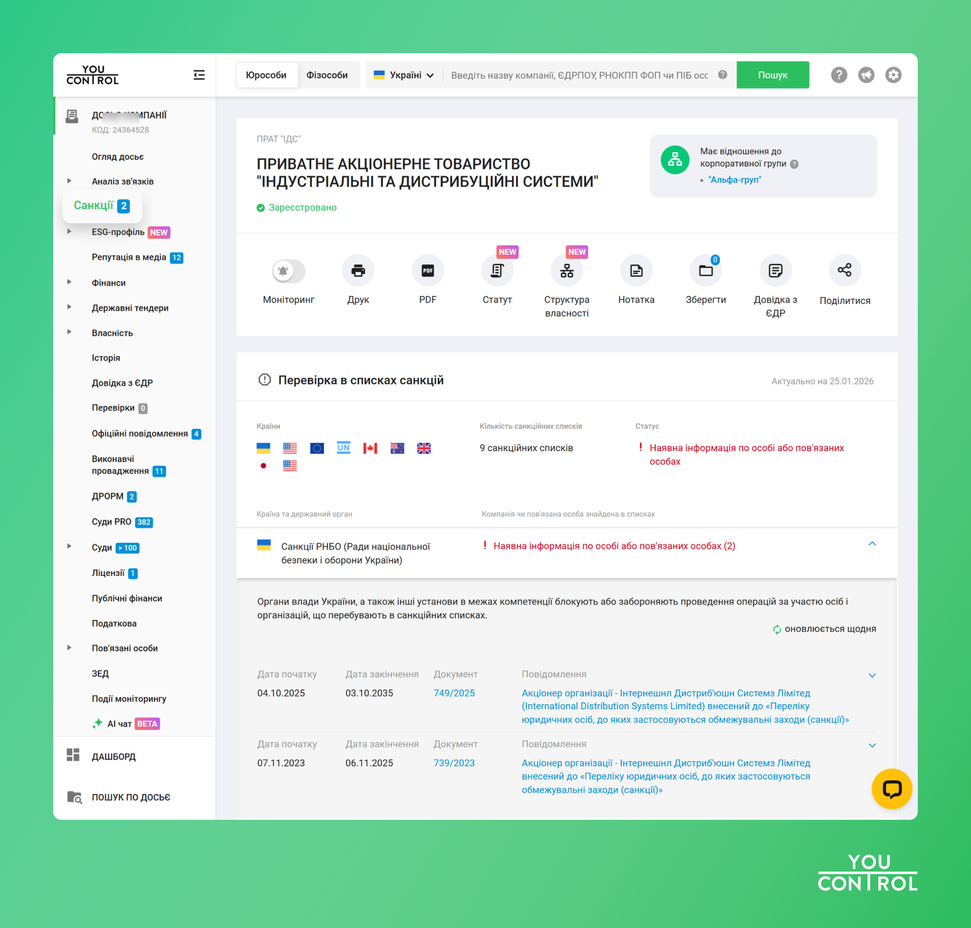 Скріншот з системи YouControl, розділ «Санкції»