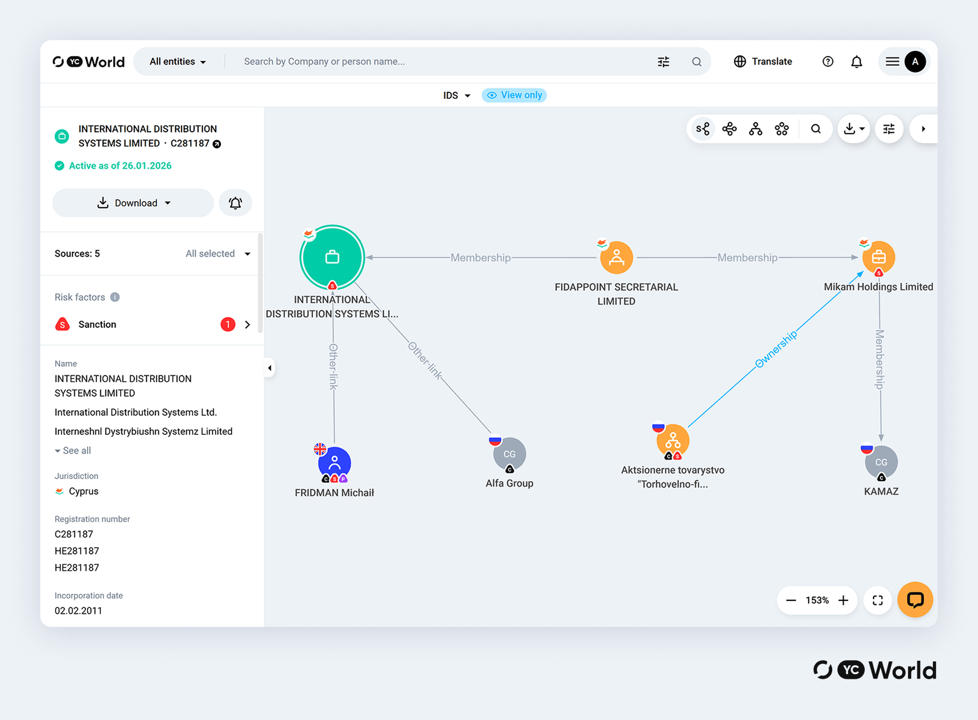 Перевірити міжнародні зв’язки кіпрської компанії INTERNATIONAL DISTRIBUTION SYSTEMS LIMITED можна за допомогою міжнародної платформи для глобального пошуку та візуалізації бізнес-зв’язків YC World від YouControl, що допомагає розкривати приховані інсайти. Наприклад, фактори ризику, пов’язані зі зв’язками цього об'єкта, зокрема сліди ризикових країн, куди за замовчуванням встановлені такі країни як: Росія, Білорусь, Іран, Куба, Північна Корея, Сирія, Китай. В даному випадку, вищезгадана компанія з Кіпру має ймовірний зв'язок з Росією та Білоруссю.