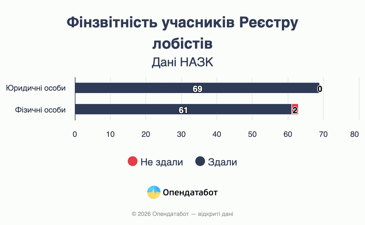 Восени минулого року в Україні розпочав роботу Реєстр лобістів, яким опікується НАЗК. За результатами року українські лобісти мали подати перший звіт про свою діяльність. Так, усі зареєстровані учасники, внесені до Реєстру торік, повинні були подати звіти до НАЗК до 31 січня 2026 року. Навіть якщо учасник неактивний, то він все одно повинен подати звіт, що підтверджує відсутність активної діяльності.