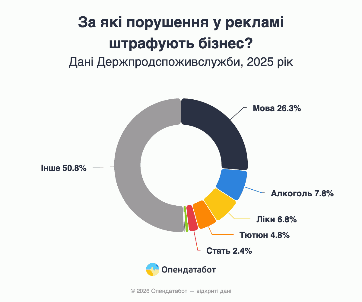 Майже 22 тисячі перевірок носіїв реклами провела Держпродспоживслужба у 2025 році. Це на 14% більше, ніж у 2024 році. Понад половина перевірок стосувалась зовнішньої реклами. Загалом 4 085 порушень у рекламі виявили торік — за рік порушень побільшало у 1,5 раза. Найбільше зауважень зібрали бізнеси на Харківщині, Київщині та Чернігівщині. А загальна сума штрафів склала 10,68 млн грн. Понад чверть порушень стосується використання недержавної мови у рекламі.