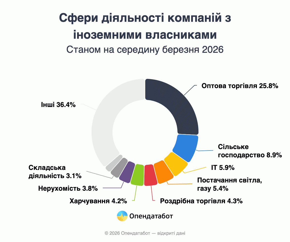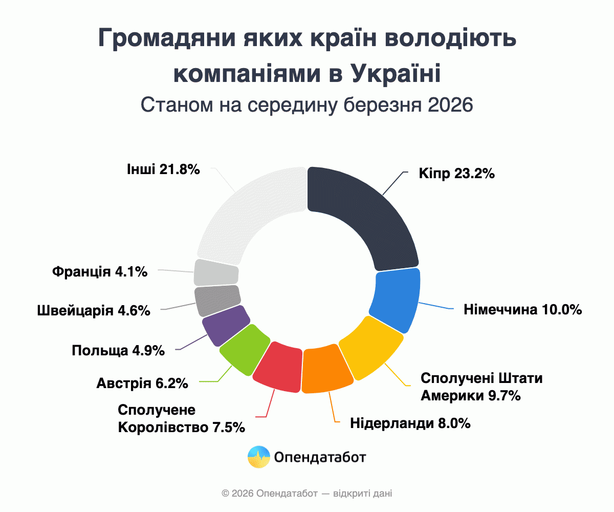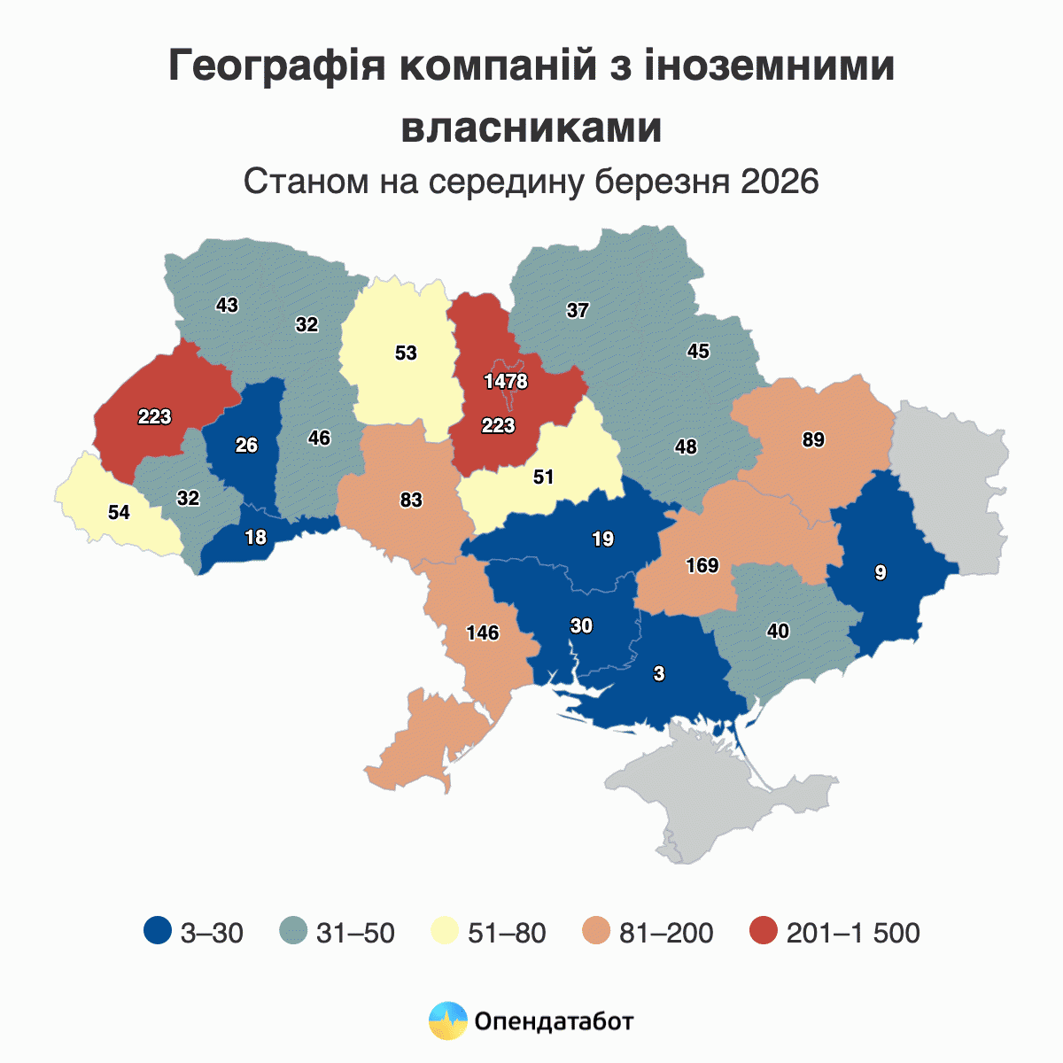 Майже 3 тисячі компаній з іноземними власниками, які здають фінансову звітність та мають доходи не менше 100 млн грн на рік, зафіксовано в Україні за даними Єдиного державного реєстру станом на середину березня 2026 року. Майже у чверті компаній у власниках — громадяни Кіпру. А найбільше бізнесу з іноземними власниками зареєстровано у столиці. Найчастіше для своїх компаній іноземці обирають сферу оптової торгівлі, сільського господарства та ІТ.