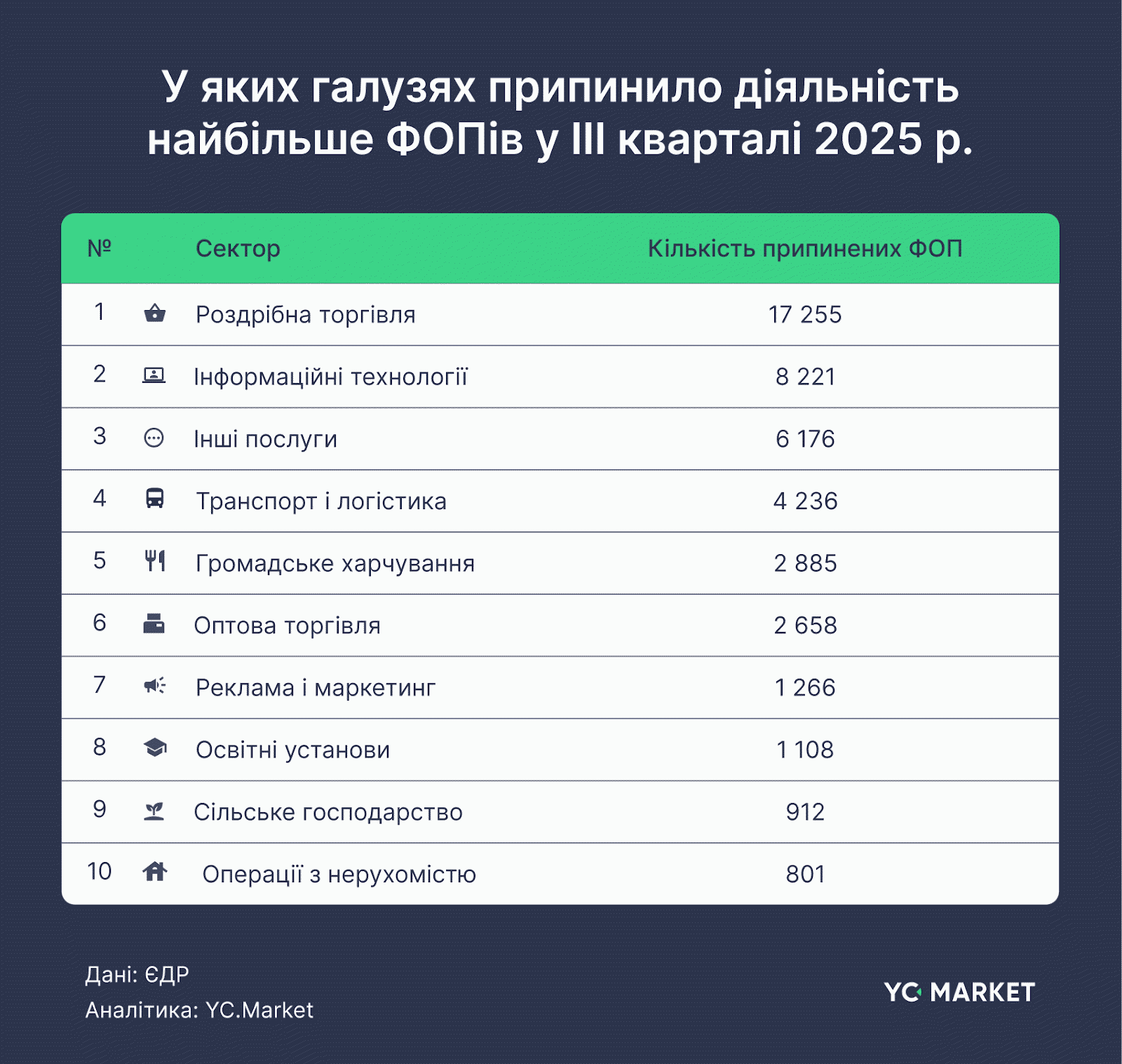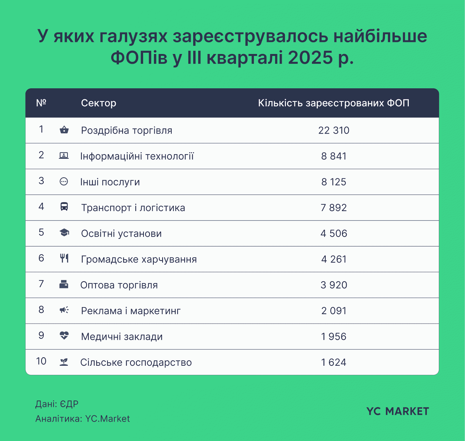 Перше місце за кількістю нових реєстрацій ФОП утримує роздрібна торгівля. За даними YC.Market, у галузі роздрібної торгівлі у 3 кварталі 2025 року зареєстровано найбільше ФОП – 22,3 тис. нових підприємців, що на 37% більше, ніж у 3 кв. 2024 року. Це частково може вказувати на відновлення внутрішнього споживчого попиту та повернення малого бізнесу в сегменті торговельних послуг. ІТ-сектор – ще один стовп малого підприємництва – посів одне з лідируючих місць за обсягом реєстрацій. В ІТ зареєструвалися тисячі нових ФОП (понад 9 тис. у попередньому кварталі, 8,9 тис. – у третьому), що забезпечило 28% приріст порівняно з минулорічним періодом.